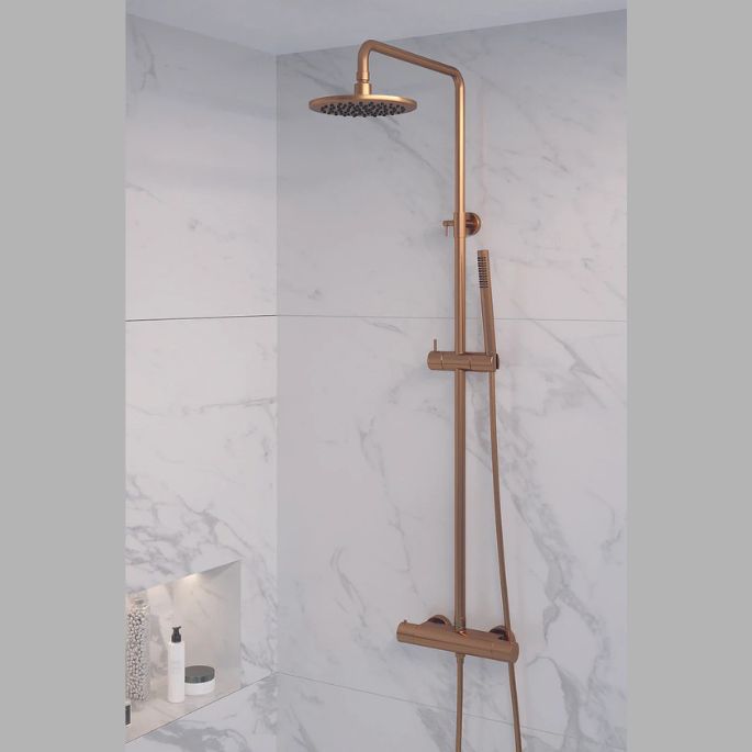 Deze Brauer Copper Edition opbouw regendouche met een staafhanddouche heeft een doorsnede van 20 cm. Hij is gemaakt van messing en is uitgevoerd in het geborsteld koper. Dit is een complete opbouw regendoucheset met een thermostaatkraan, een staafhanddouche en een hoofddouche met een doorsnede van 20 cm. Deze douche geeft jou een comfortabele en heerlijke douche ervaring. De kraan is gemakkelijk te bedienen, met de linker draaiknop kun je de sterkte van de stralen bepalen en kun je kiezen tussen een hoofd- of handdouche. Met de rechter draaiknop kun je gemakkelijk de gewenste temperatuur instellen. Het fijne van deze kraan is dat hij een kinderbeveiliging heeft op 38°C. Hierdoor kan hij nooit opeens te heet worden. De opbouw regendouche is goed te combineren met andere Brauer producten uit de serie Copper Edition.
