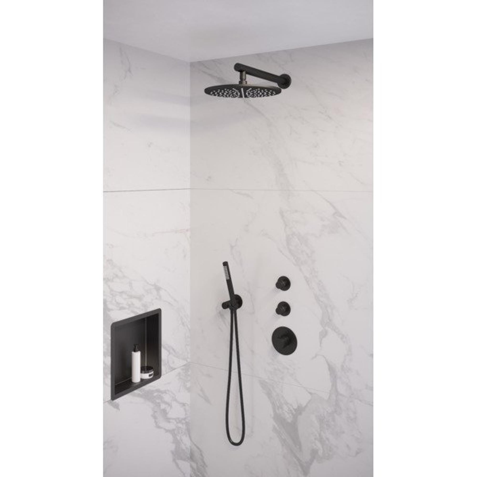 De mat zwarte afwerking van deze regendoucheset geeft een moderne en elegante uitstraling aan jouw badkamer. Het minimalistische ontwerp past perfect bij een eigentijdse inrichting. De strakke lijnen en gladde knoppen zorgen voor een tijdloze en chique look, waardoor deze set een blikvanger wordt in de ruimte.