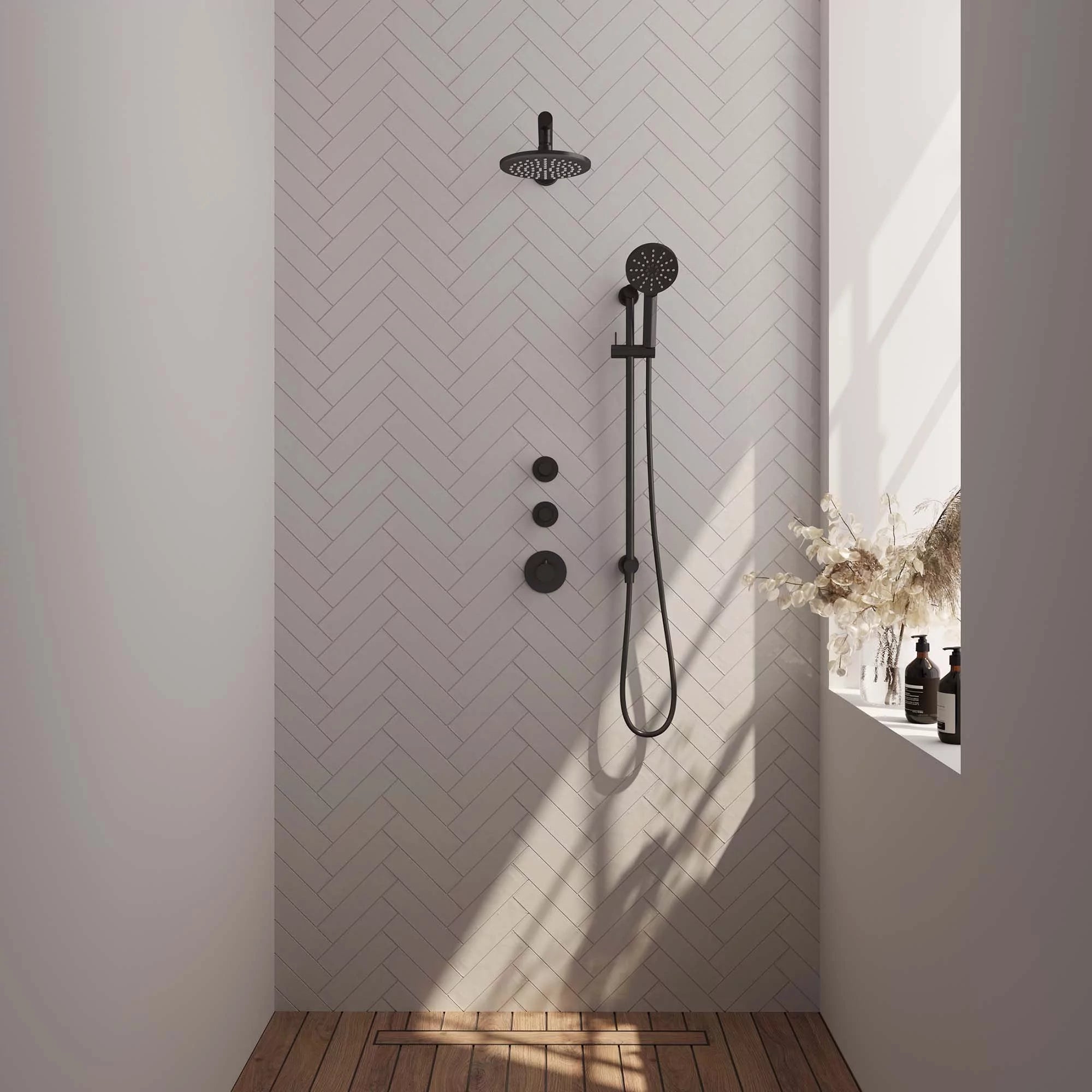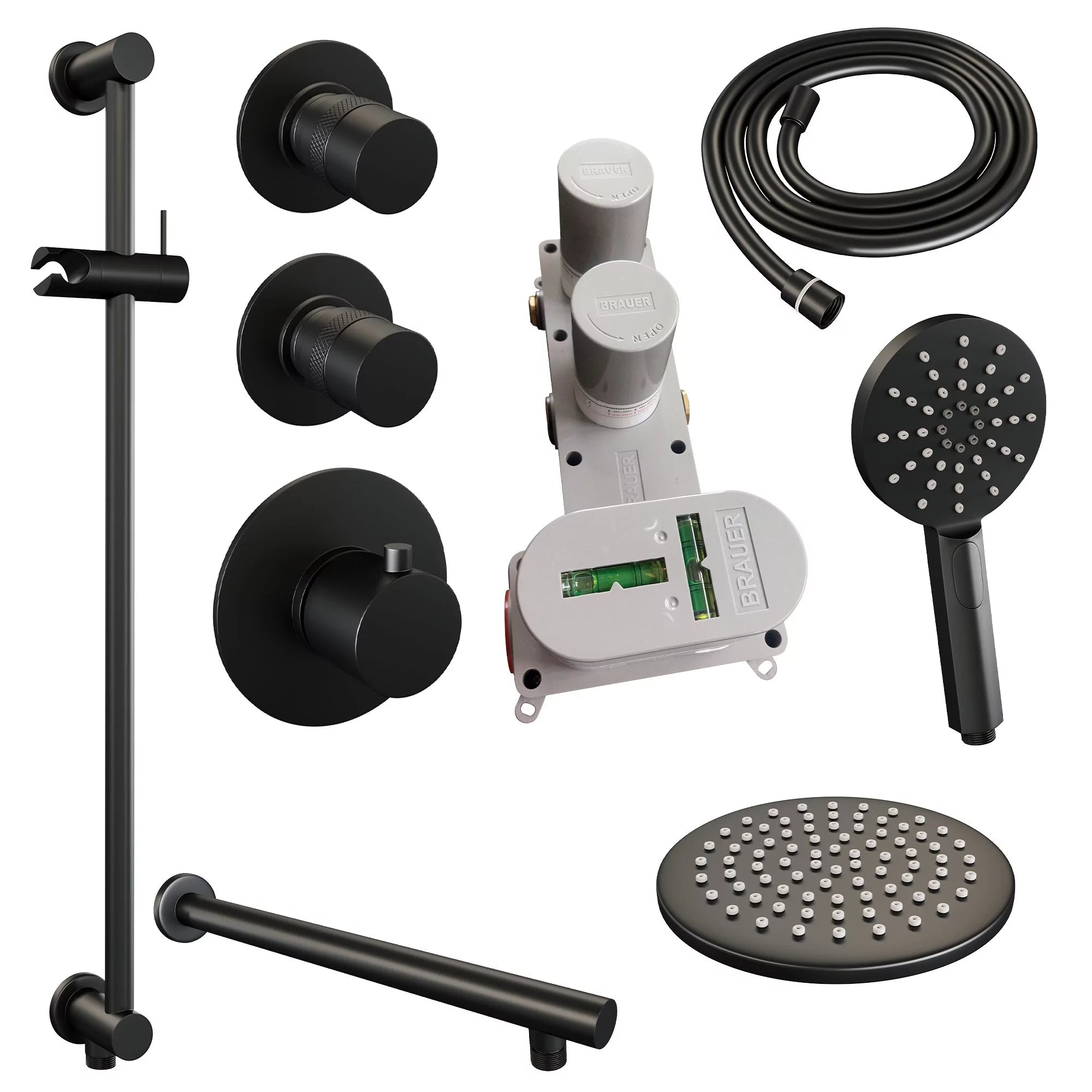 BRAUER Black Edition thermostatische inbouw regendouche SET 19 met 20 cm douchekop en rechte muurarm en 3-standen handdouche en doucheslang en geïntegreerde glijstang mat zwart