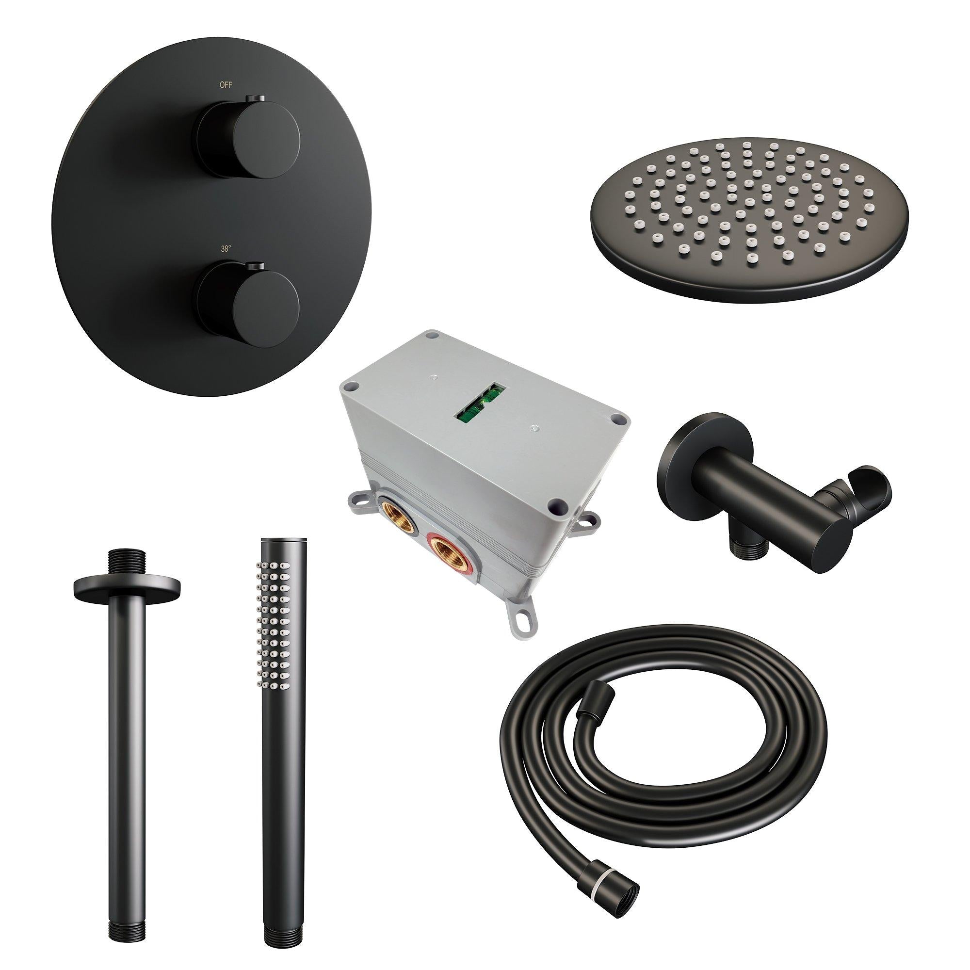 Deze regendouche set straalt stijl en klasse uit. Het ronde ontwerp en de mat zwarte afwerking geven een moderne uitstraling aan je badkamer. De combinatie van de 20cm hoofddouche en de staaf handdouche zorgt voor ultiem comfort en gemak tijdens het douchen. Met de plafondarm en doucheslang is de installatie eenvoudig en past deze set perfect bij elke badkamerstijl.