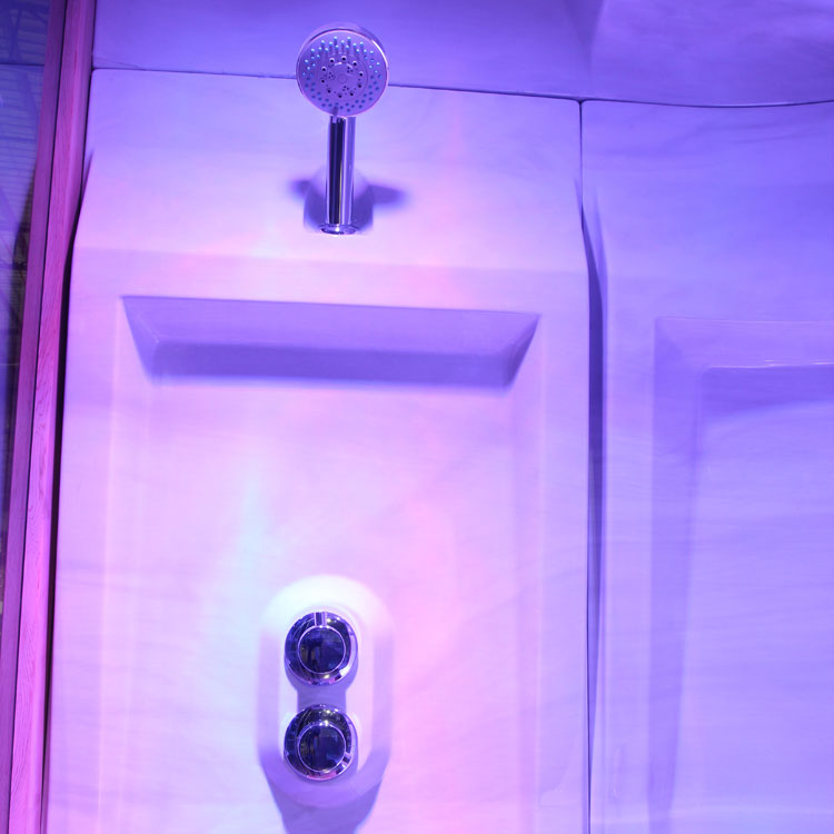 • Achterwanden en plafond gemaakt van hoogwaardig acryl van Aristech (USA) met antibacterieel oppervlak in Silver Marble (optioneel zijn 7 verschillende kleuren verkrijgbaar die passen bij onze buitenzwembaden)