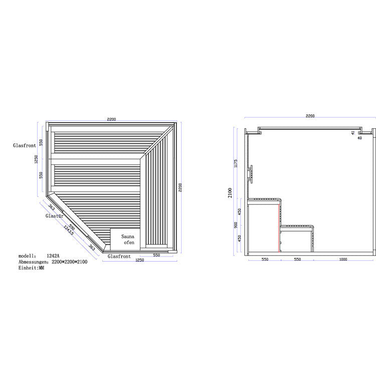 • 2200mm x 2200mm x 2100mm (lengte x breedte x hoogte)