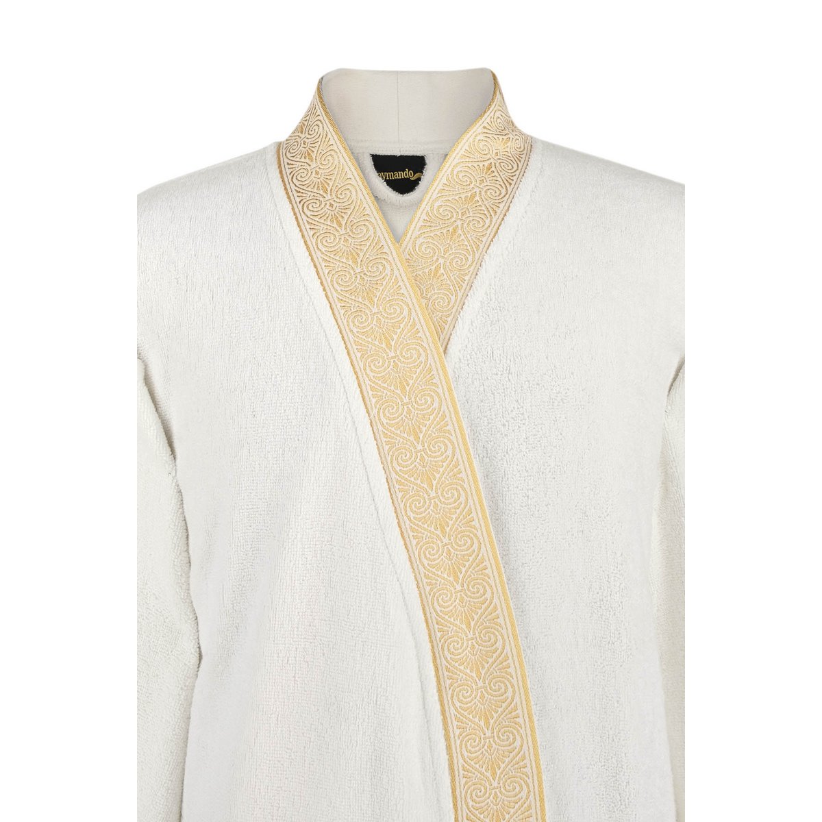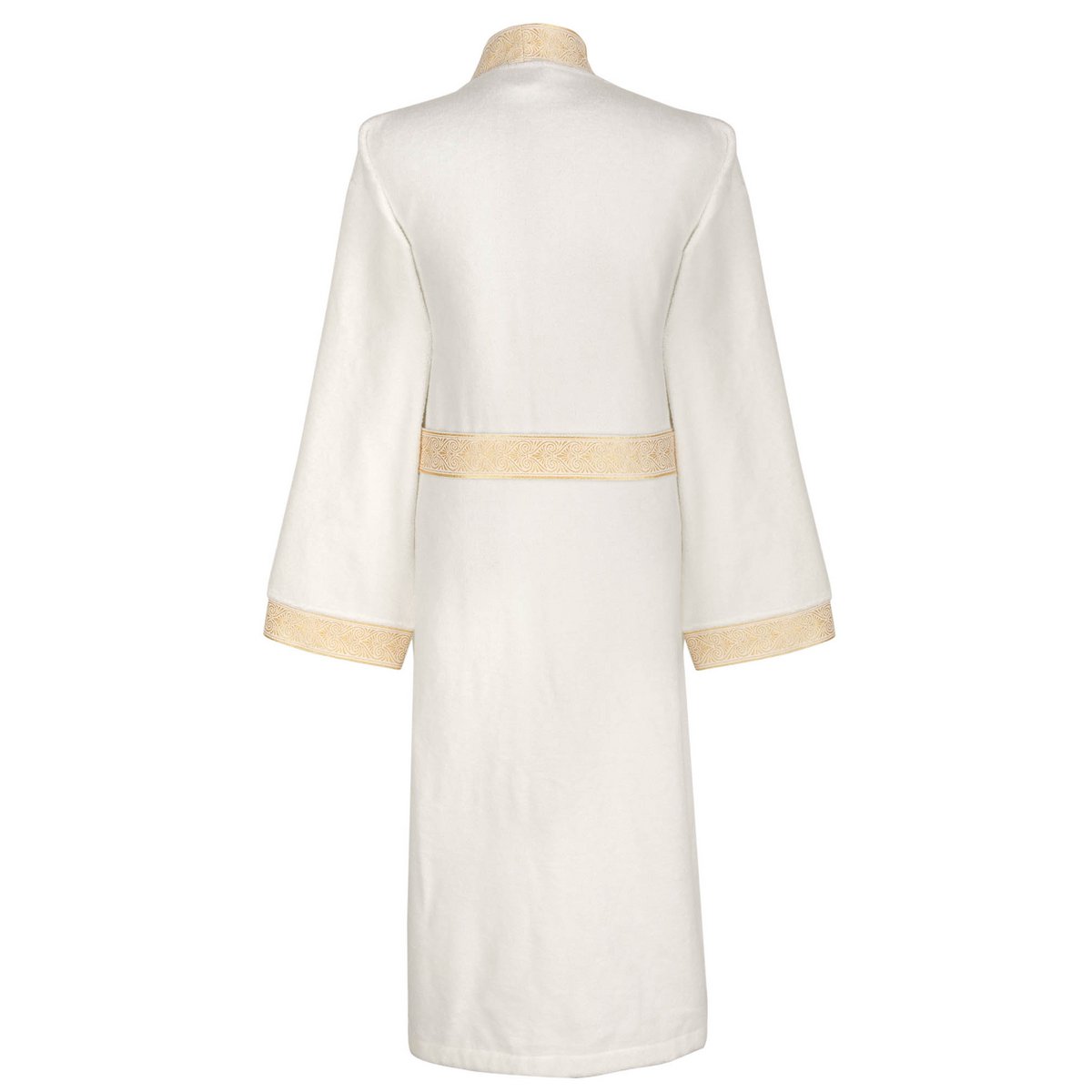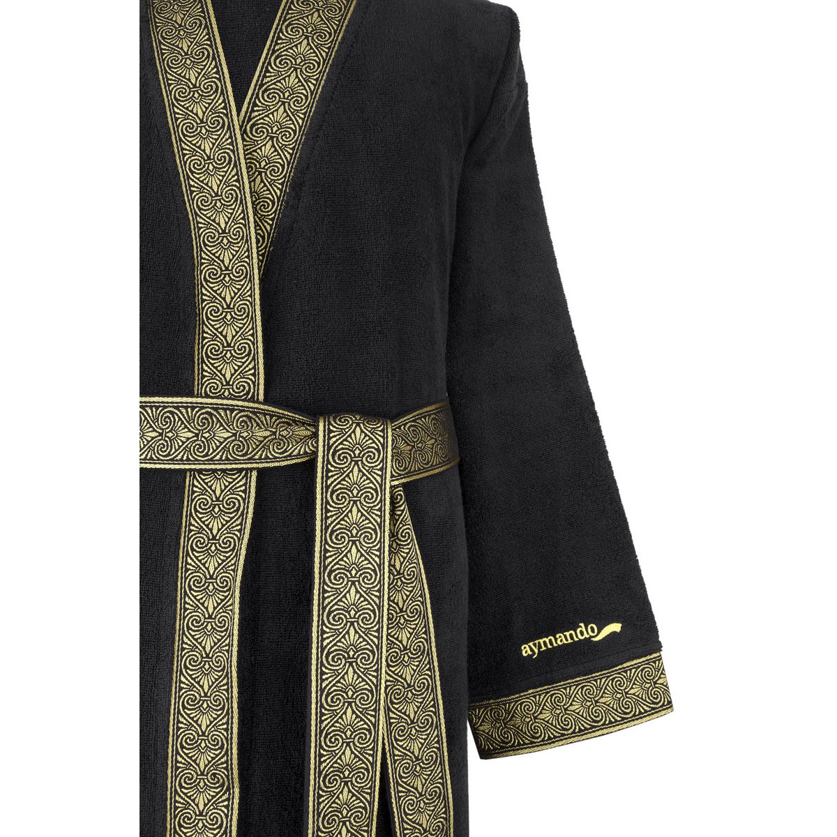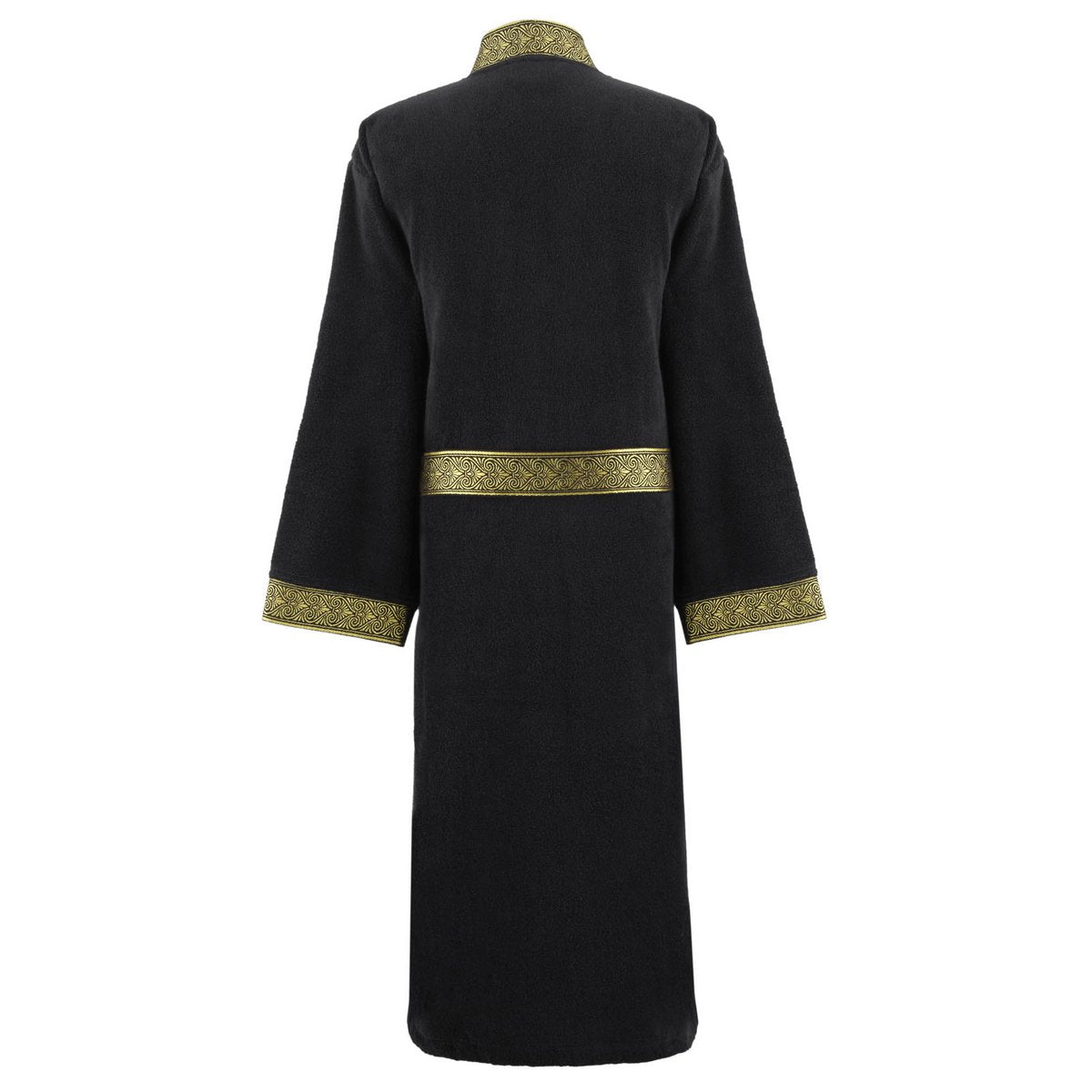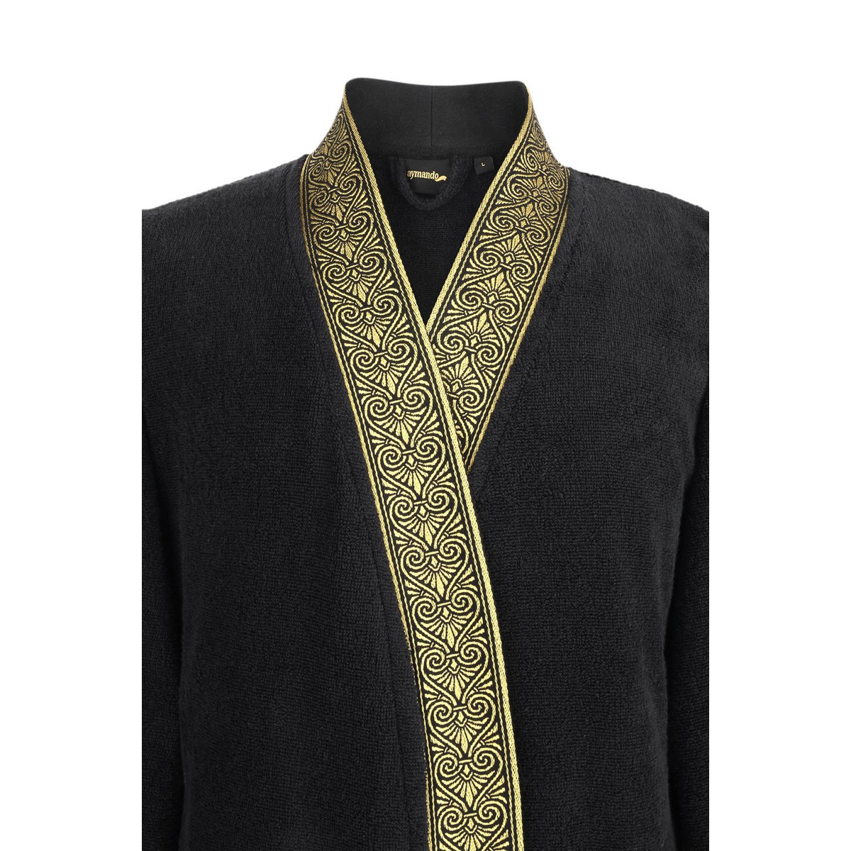 De geborduurde bies met gouden ornamenten geeft de badjas een verfijnde, extravagante uitstraling. De stijlvolle afwerking in combinatie met praktische details zoals twee zijzakken, een knoopriem met goudmotief, en een ophang lus maken deze badjas zowel functioneel als modieus.