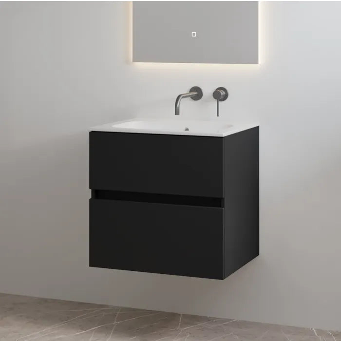 Splash badkamermeubel mag niet ontbreken in jouw badkamer! Splash is compact maar brengt moderne elegantie in je badkamer met zijn zwart matte onderkast en strak wastafelblad. Doordat dit model greeploos is, zorgt het voor een rustige uitstraling. De lades zijn voorzien van een softclose sluiting en bieden genoeg ruimte voor je badkamerartikelen.