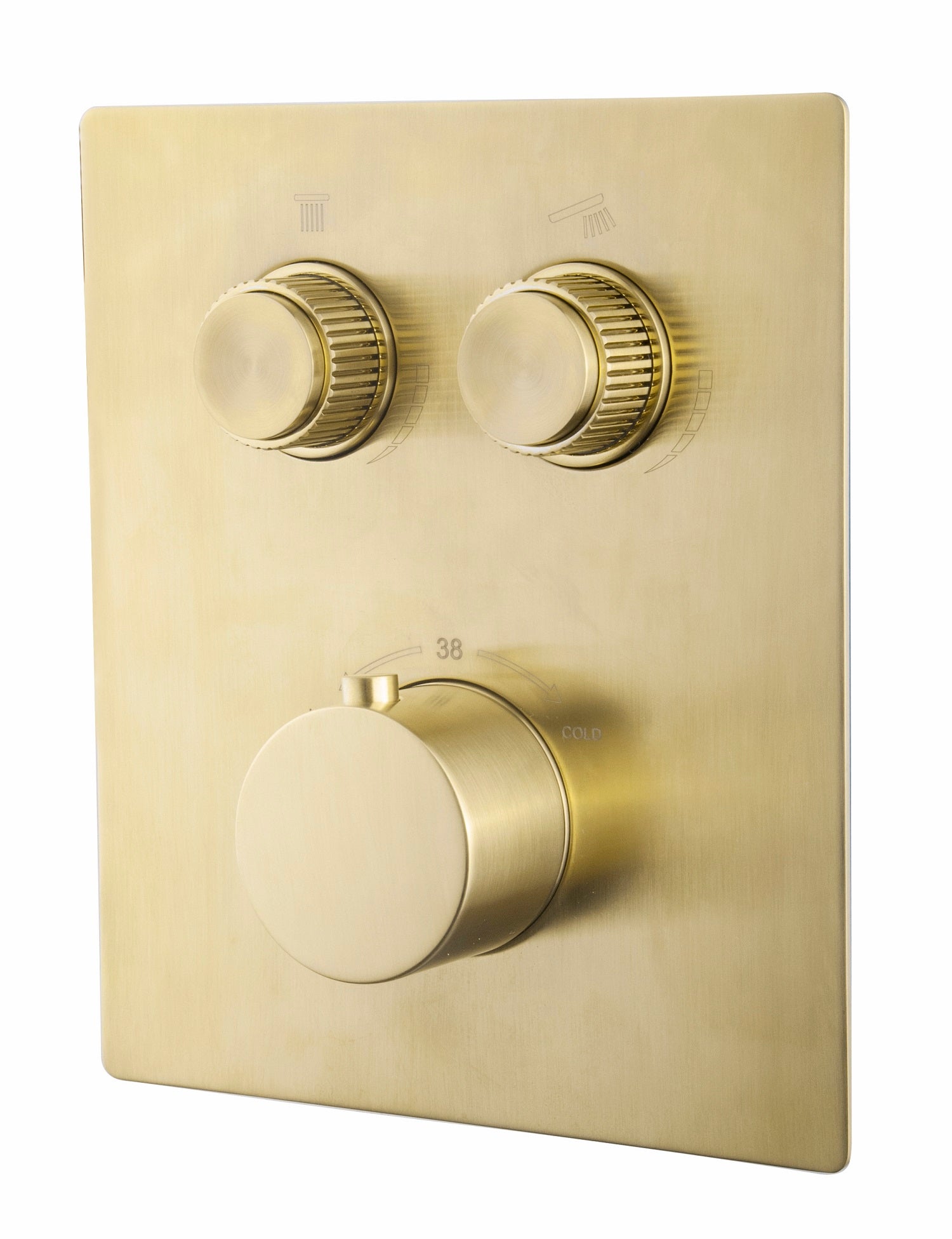 Kies voor luxe en comfort! De Caral Klik Pro is een stijlvolle en hoogwaardige inbouwthermostaat met Smartcontrol. Dit Caral Klik Pro afbouwdeel voor de inbouwthermostaat 2-weg heeft de kleur geborsteld messing en beschikt over 2 functies. Zo kun je eenvoudig in één klik schakelen tussen de handdouche en hoofddouche. Door middel van de Smartcontrol bedieningsknoppen is de mengkraan gemakkelijk aan en uit te zetten. Daarnaast bepaal je door te draaien de gewenste waterdruk. De watertemperatuur is thermostatisch te regelen en heeft een begrenzer op 38°c. Dit maakt dat de kraan ook veilig te gebruiken is door kinderen.