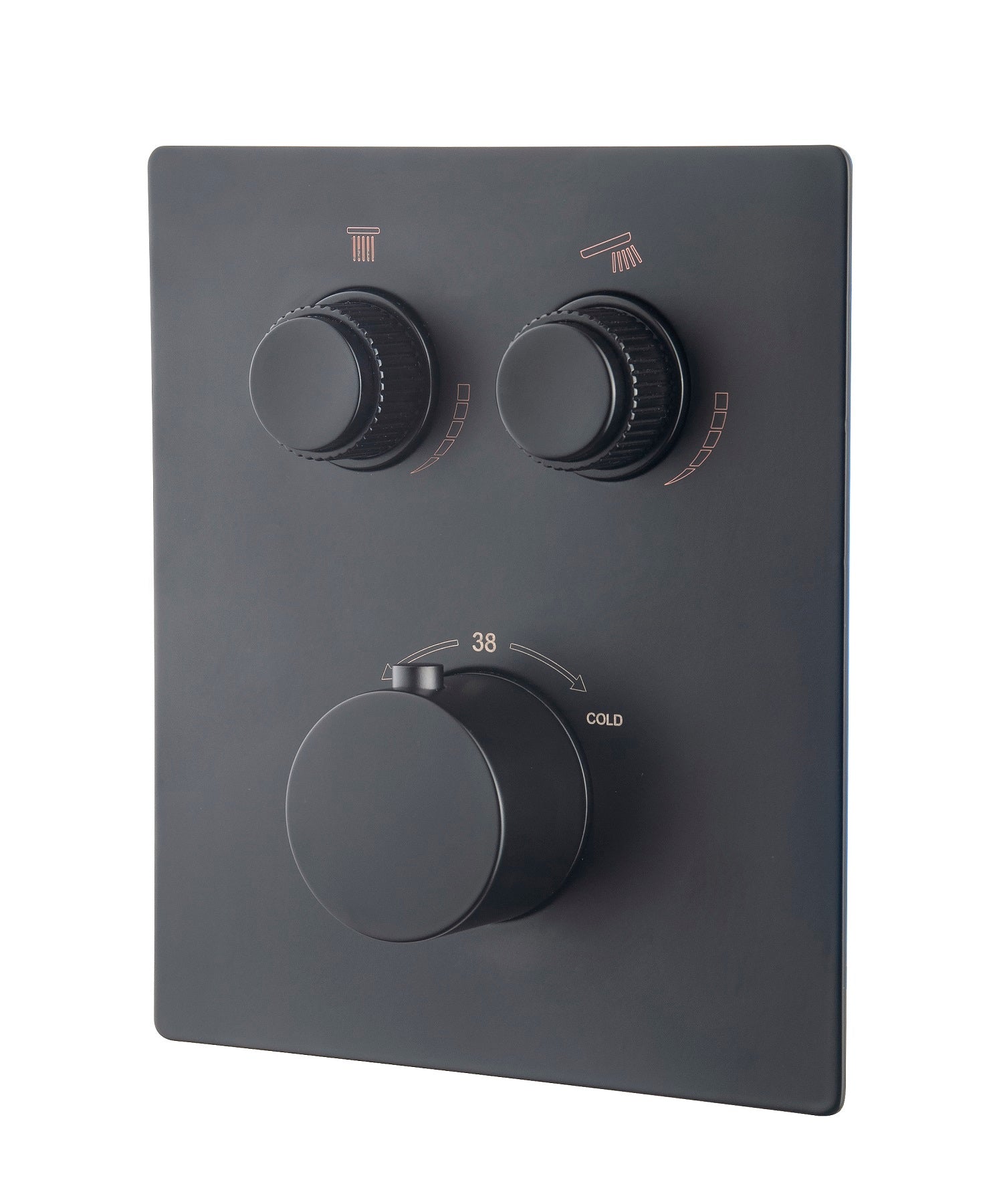 Kies voor luxe en comfort! De Caral Klik Pro is een stijlvolle en hoogwaardige inbouwthermostaat met Smartcontrol. Dit Caral Klik Pro afbouwdeel voor de inbouwthermostaat 2-weg heeft een mat zwarte kleur en beschikt over 2 functies. Zo kun je eenvoudig in één klik schakelen tussen de handdouche en hoofddouche. Door middel van de Smartcontrol bedieningsknoppen is de mengkraan gemakkelijk aan en uit te zetten. Daarnaast bepaal je door te draaien de gewenste waterdruk. De watertemperatuur is thermostatisch te regelen en heeft een begrenzer op 38°c. Dit maakt dat de kraan ook veilig te gebruiken is door kinderen.