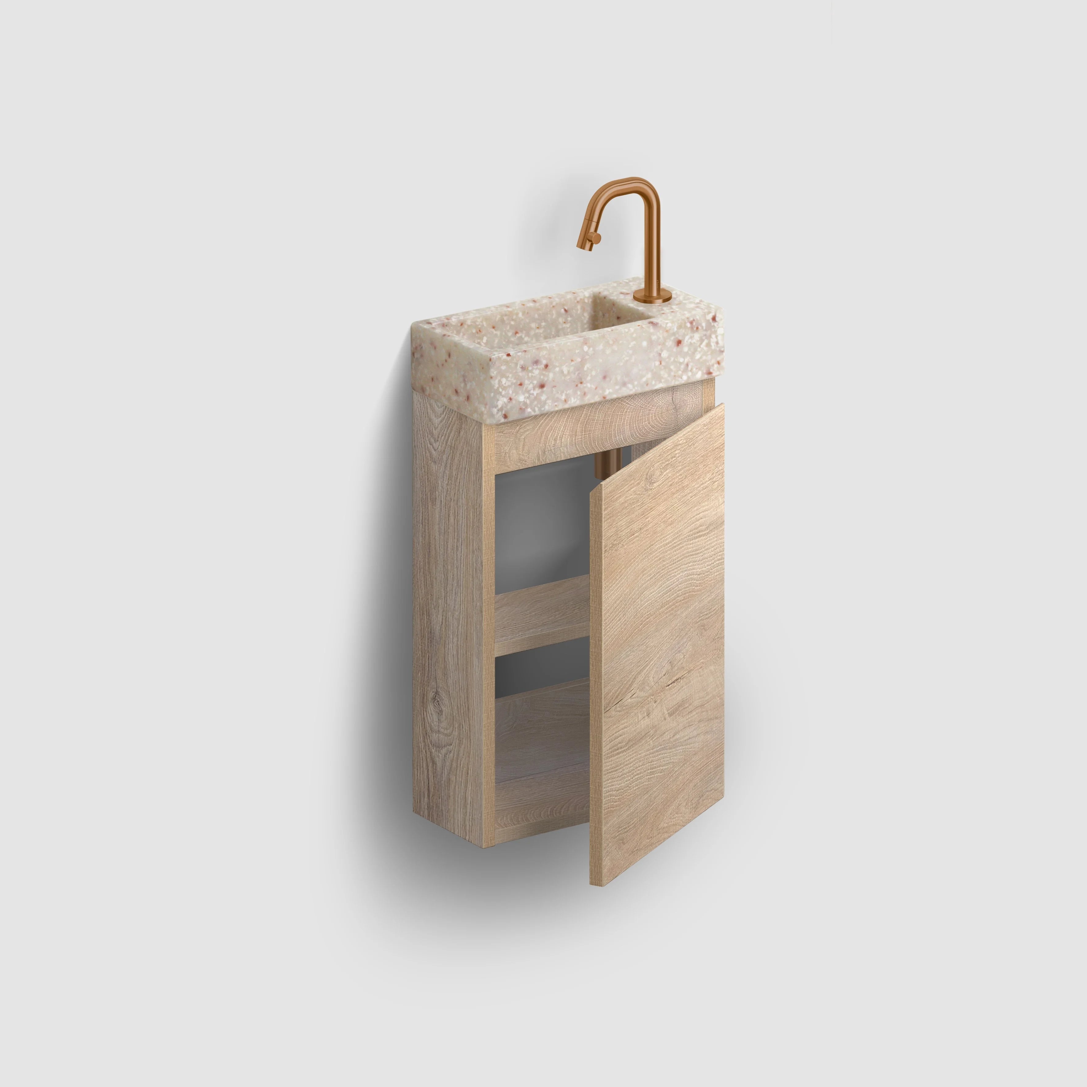 Ondanks dat deze onderkast weinig ruimte in beslag neemt, beschikt hij wel over genoeg opbergruimte. Achter de, naar rechts draaiende, deur bevinden zich namelijk twee plankjes. Hier kun je spullen kwijt die je wel bij de hand wilt hebben, maar niet in het zicht wilt hebben staan zoals toiletrollen of handdoekjes. Zo creëer jij een nette en opgeruimde uitstraling wat zorgt voor extra rust!