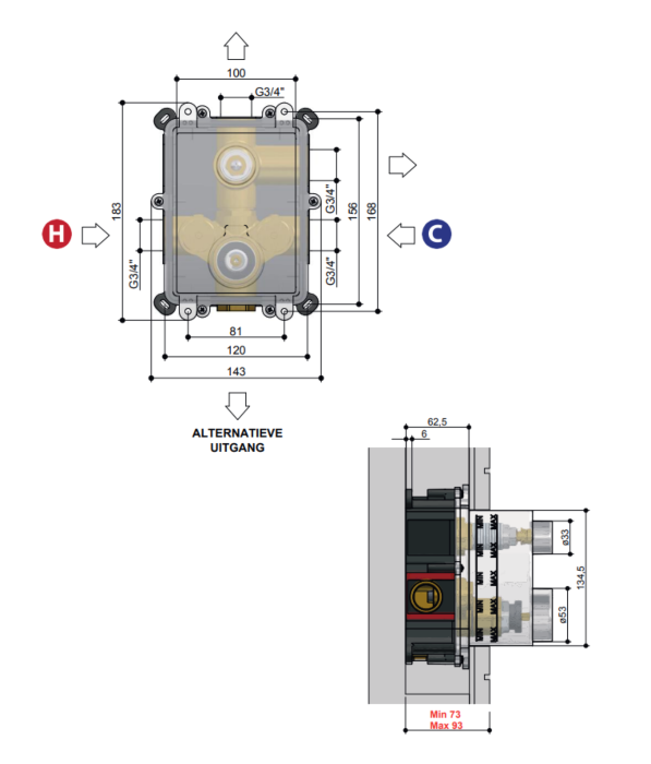 De doucheset heeft een inbouwdeel en afbouwdeel met een 2-wegs omstel. De temperatuur en de waterstraal kun je hiermee bedienen. Op 38 graden zit een beveiliging, waardoor het water pas warmer dan 38 graden wordt, na het verwijderen van de beveiliging. Extra veilig voor het hele gezin.