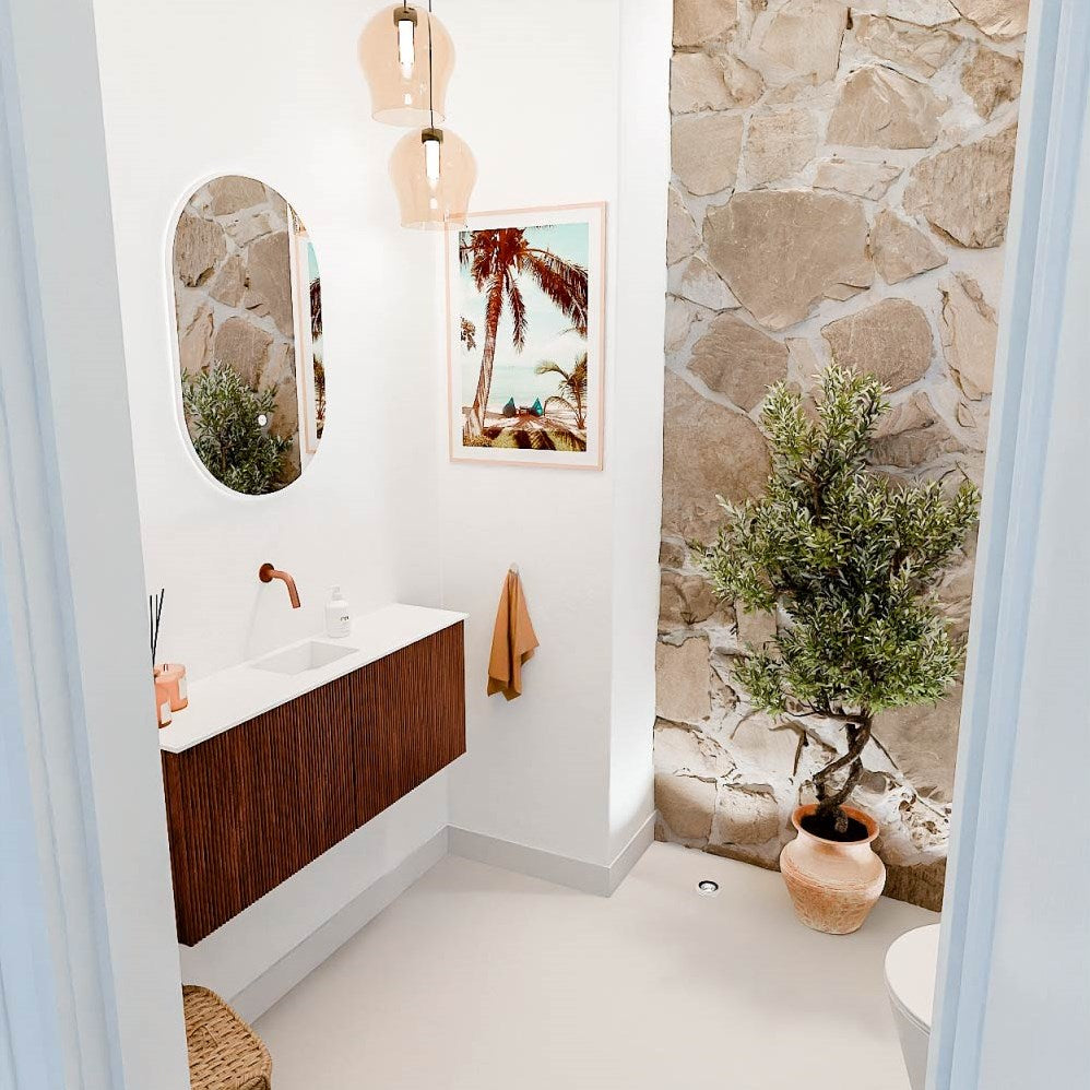 JOYA 100cm toiletmeubel kleur Ruby. Wastafel FAYE positie Midden Zonder kraangat kleur Talc.