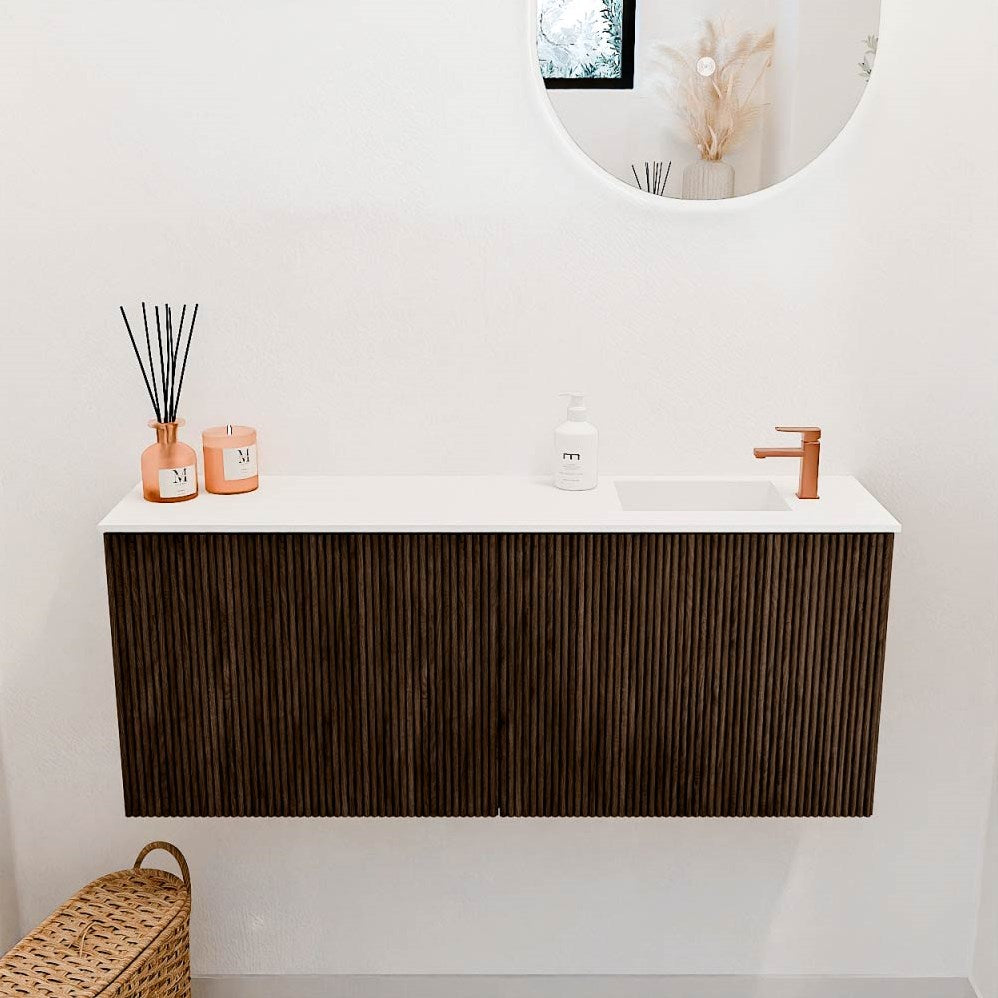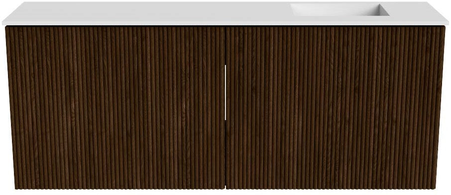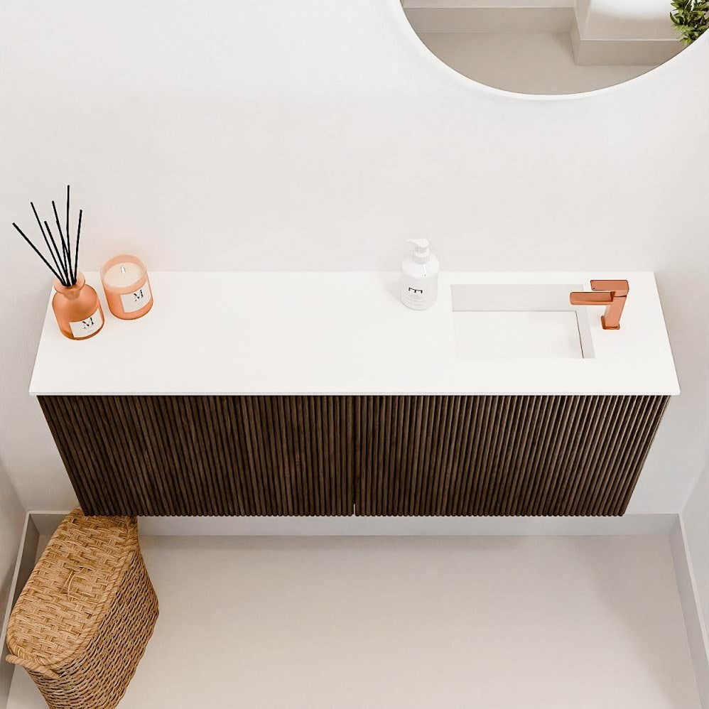 JOYA 100cm toiletmeubel kleur Walnut. Wastafel FAYE positie Rechts 1 kraangat kleur Talc.