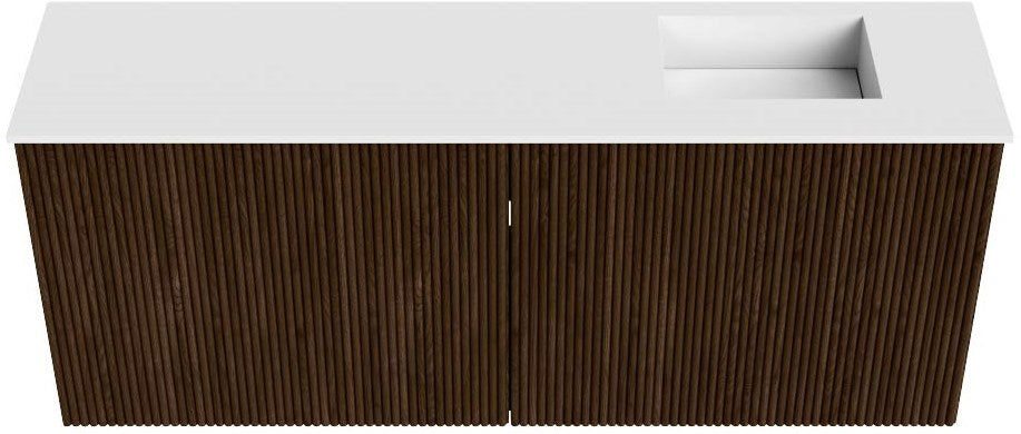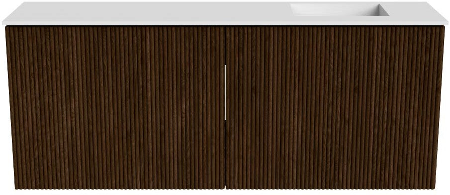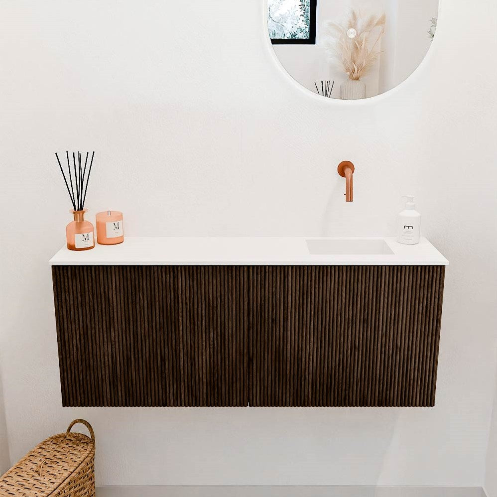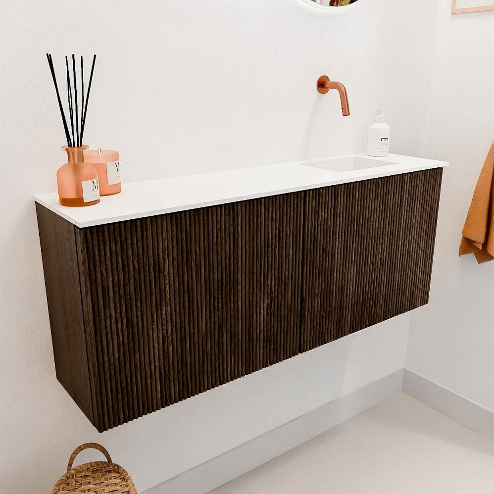 JOYA 100cm toiletmeubel kleur Walnut. Wastafel FAYE positie Rechts Zonder kraangat kleur Talc.