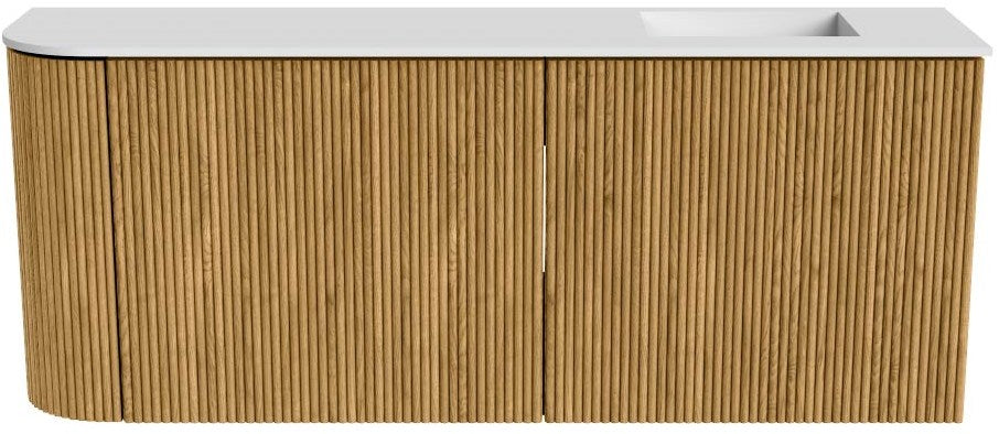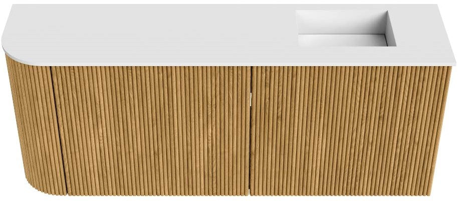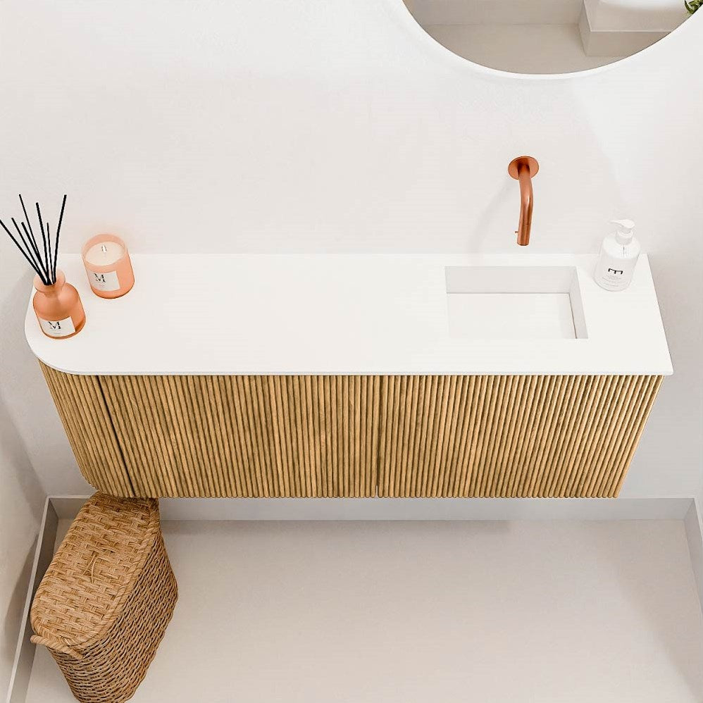 JOYA 101,6cm toiletmeubel ronding links kleur Oak. Wastafel FAYE positie Rechts Zonder kraangat kleur Talc.
