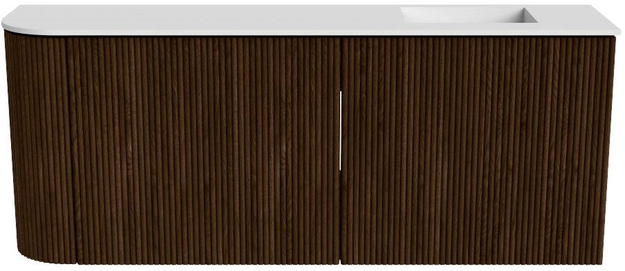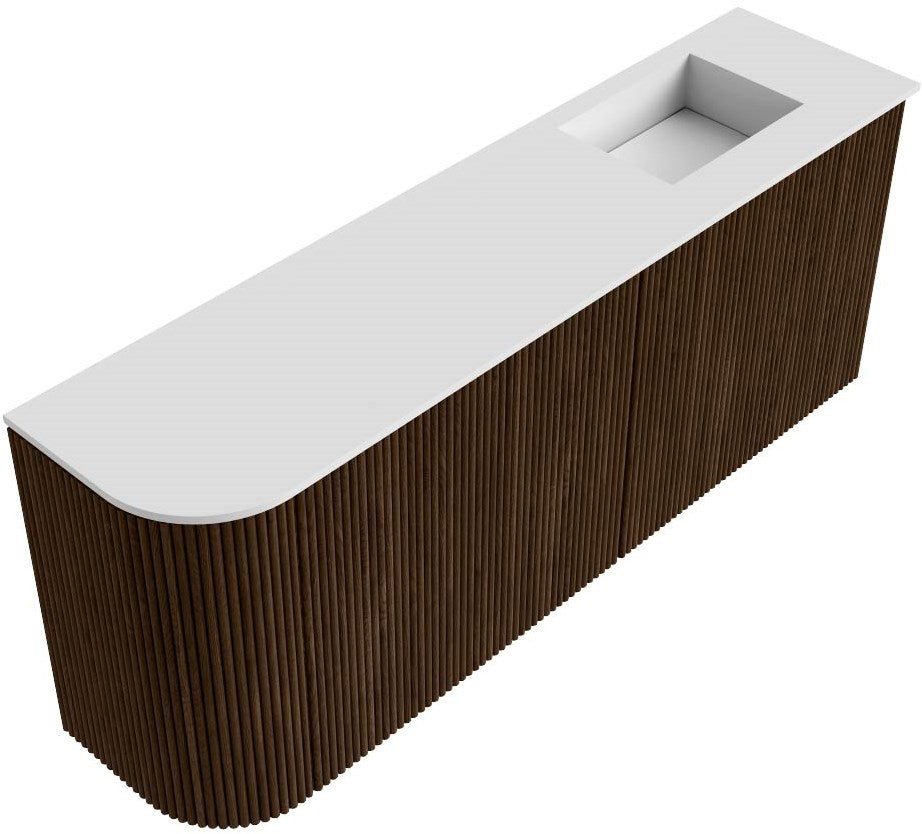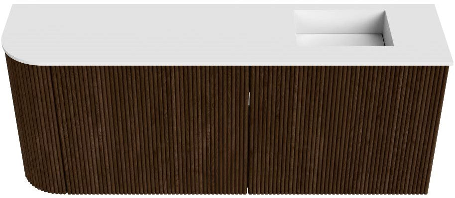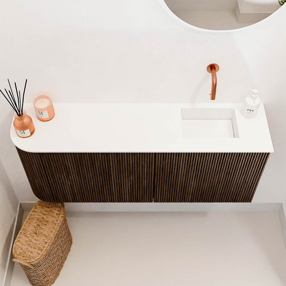 JOYA 101,6cm toiletmeubel ronding links kleur Walnut. Wastafel FAYE positie Rechts Zonder kraangat kleur Talc.