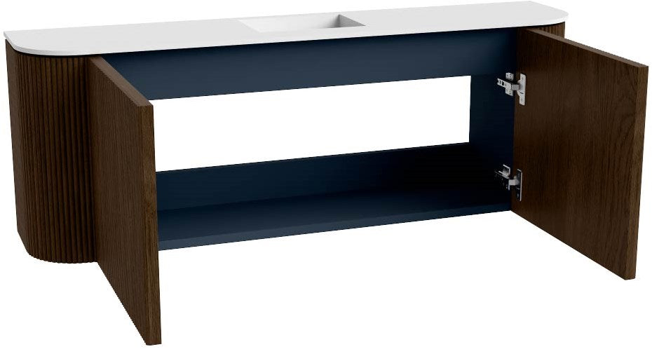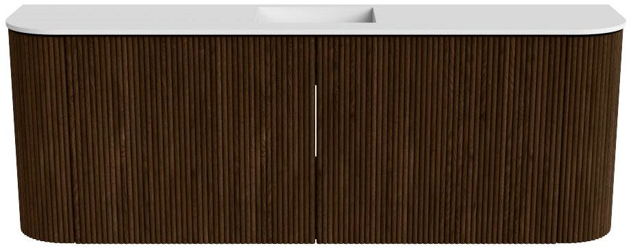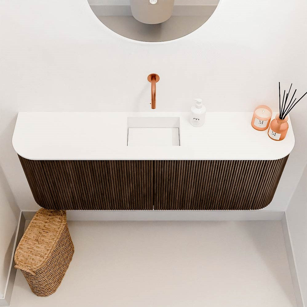 JOYA 113,2cm toiletmeubel ronding links + rechts kleur Walnut. Wastafel FAYE positie Midden Zonder kraangat kleur Talc.