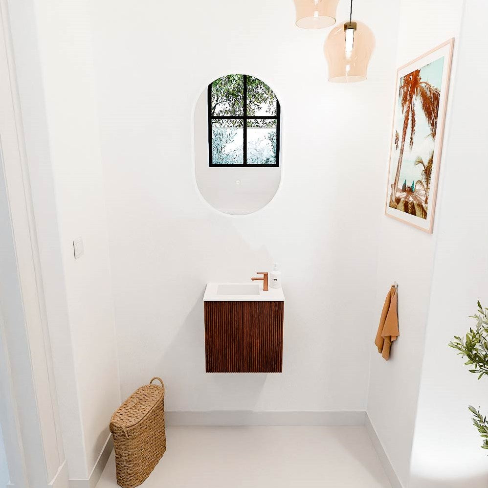 JOYA 40cm toiletmeubel kleur Ruby. Wastafel FAYE positie Links 1 kraangat kleur Talc.