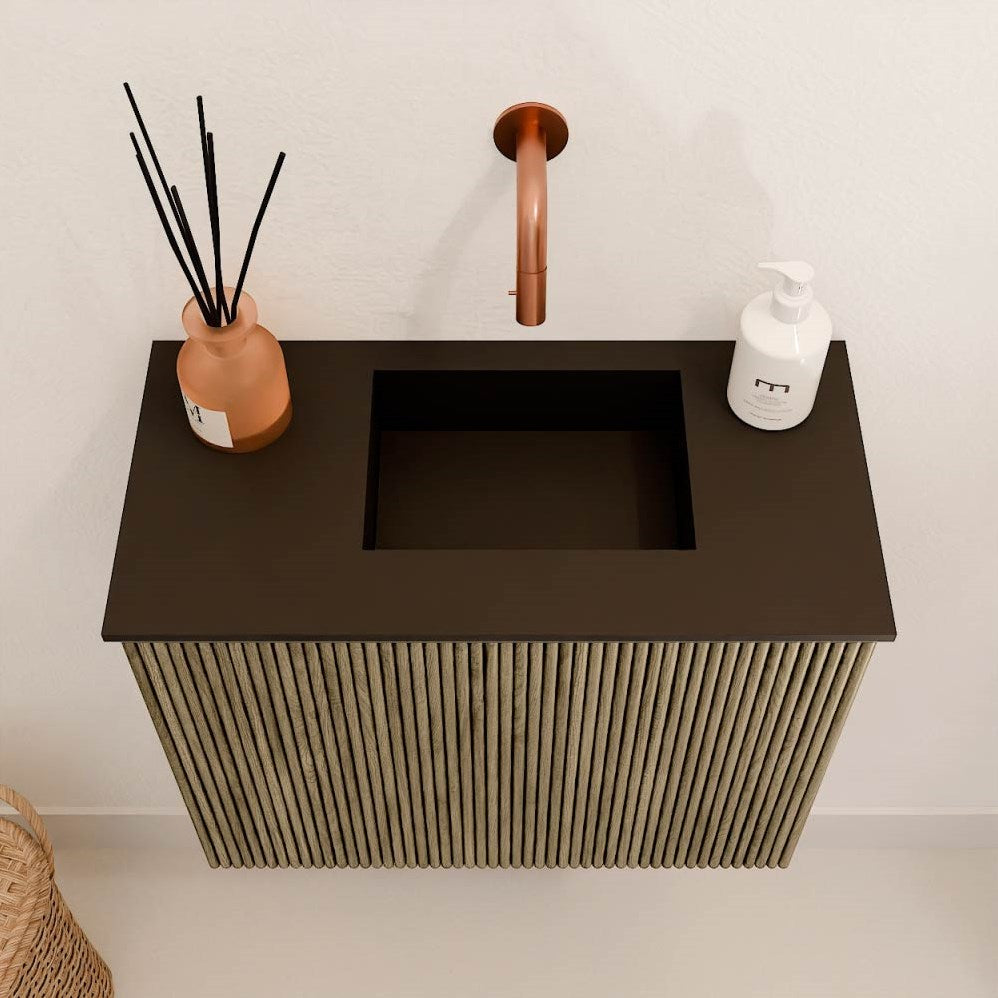 Inclusief hoogwaardige FAYE-wastafel in twee kleuren: Solid Surface Talc (wit) of Urban (zwart)