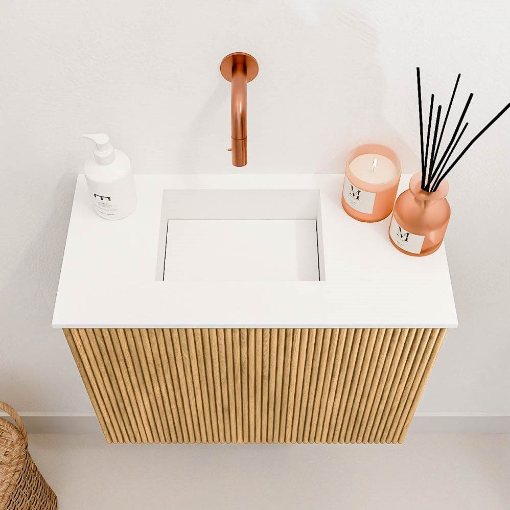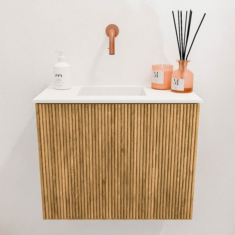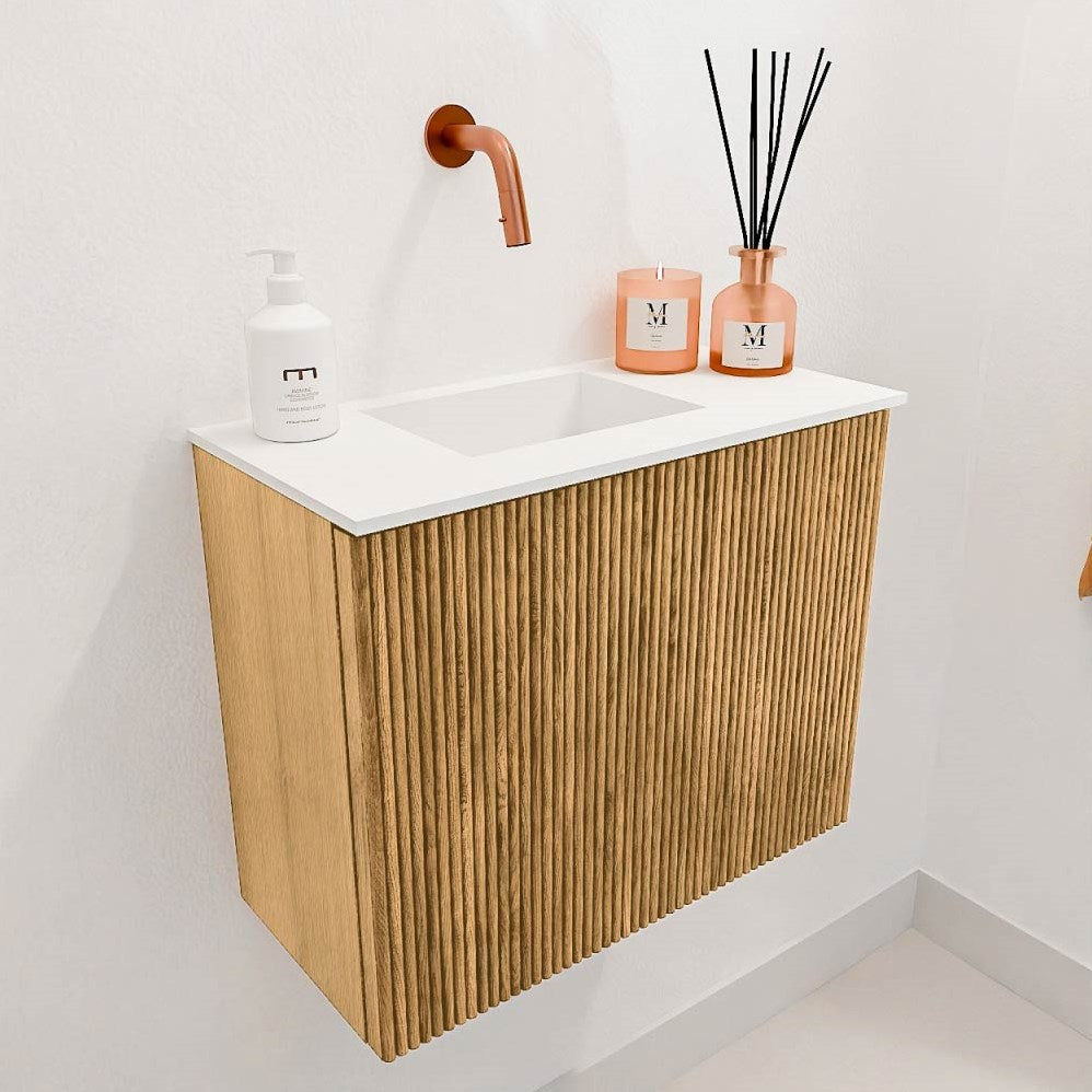 JOYA 50cm toiletmeubel kleur Oak. Wastafel FAYE positie Links Zonder kraangat kleur Talc.