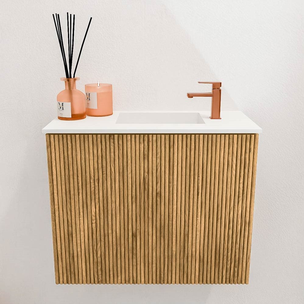 JOYA 50cm toiletmeubel kleur Oak. Wastafel FAYE positie Rechts 1 kraangat kleur Talc.