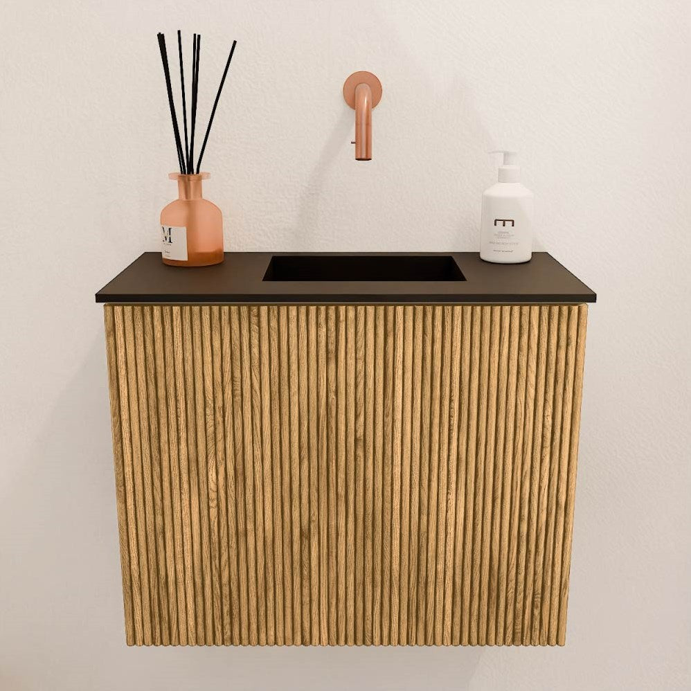 Upgrade je badkamer met het elegante JOYA wastafelmeubel, ontworpen met karakteristieke verticale ribben voor een moderne en verfijnde uitstraling. Gemaakt van massief eiken en eikenfineer, combineert dit premium meubel natuurlijke schoonheid met uitzonderlijke duurzaamheid. Met oog voor detail en vakmanschap is dit de perfecte keuze voor een luxueuze en stijlvolle badkamer.