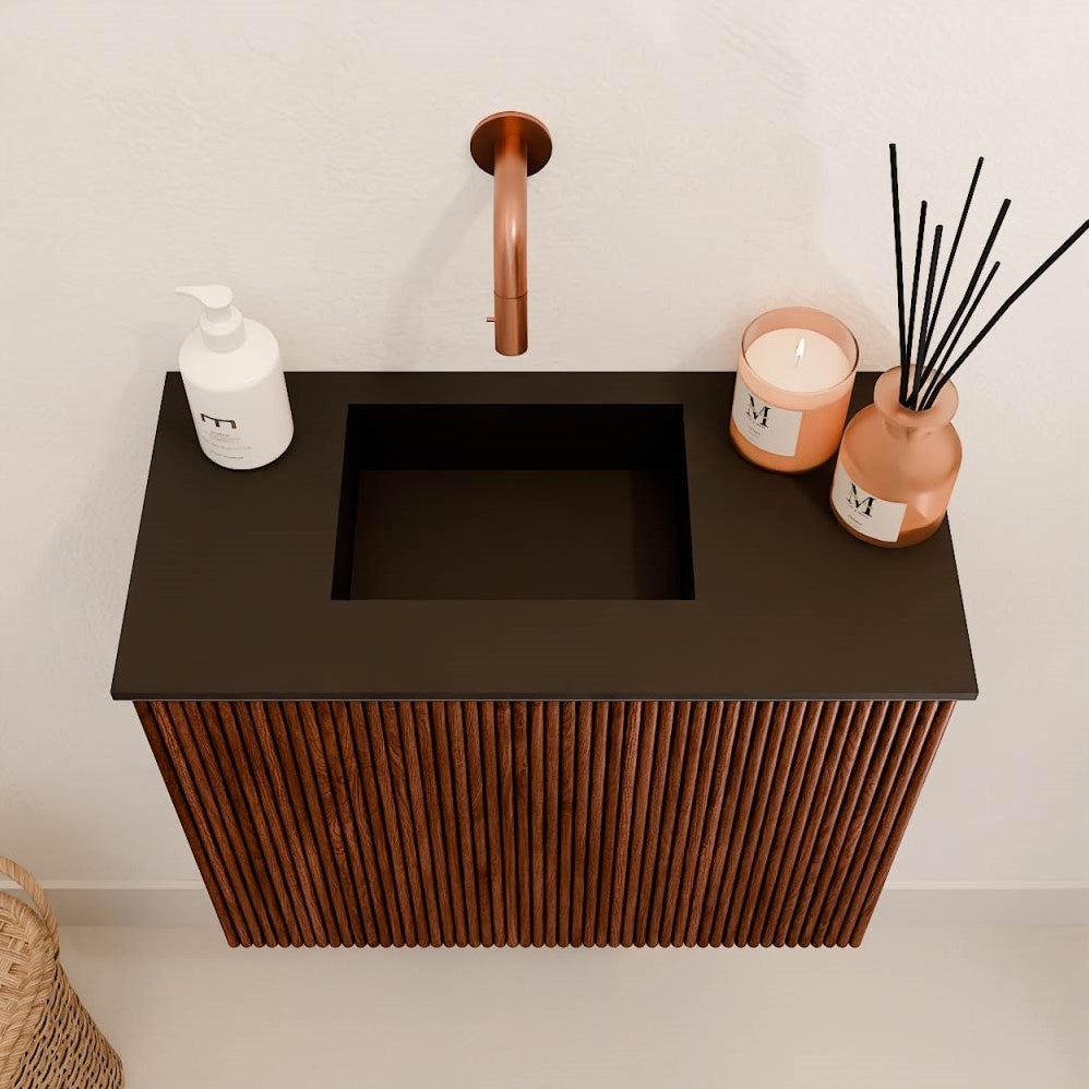 Inclusief hoogwaardige FAYE-wastafel in twee kleuren: Solid Surface Talc (wit) of Urban (zwart)