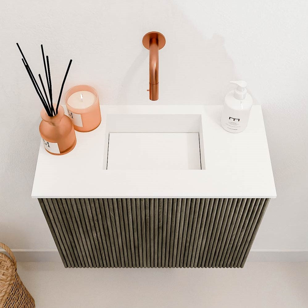 Inclusief hoogwaardige FAYE-wastafel in twee kleuren: Solid Surface Talc (wit) of Urban (zwart)