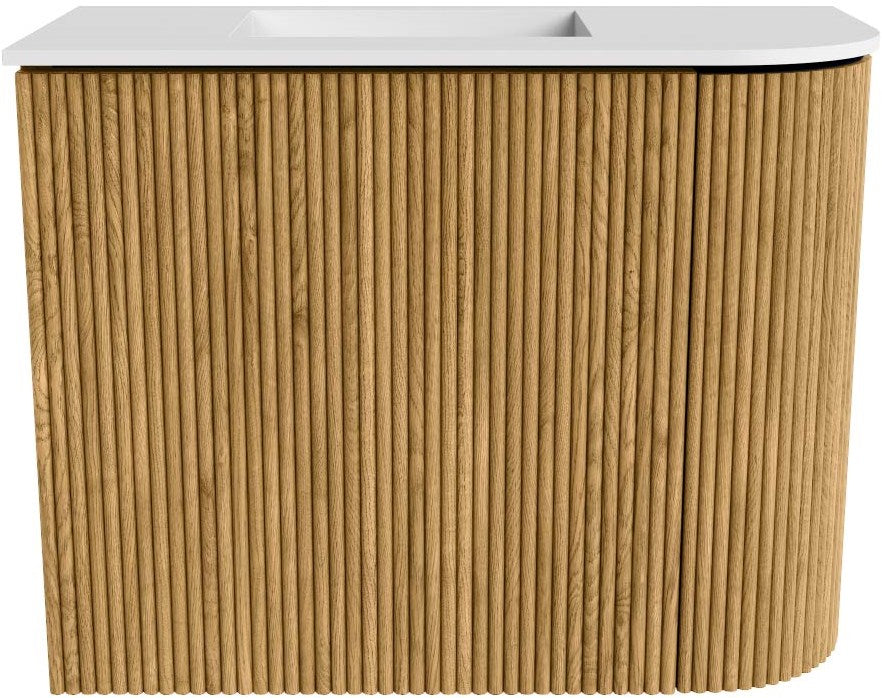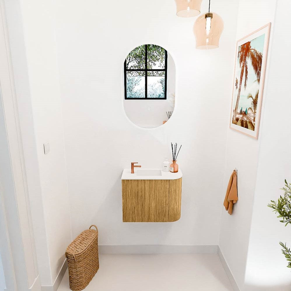 JOYA 51,6cm toiletmeubel ronding rechts kleur Oak. Wastafel FAYE positie Links 1 kraangat kleur Talc.