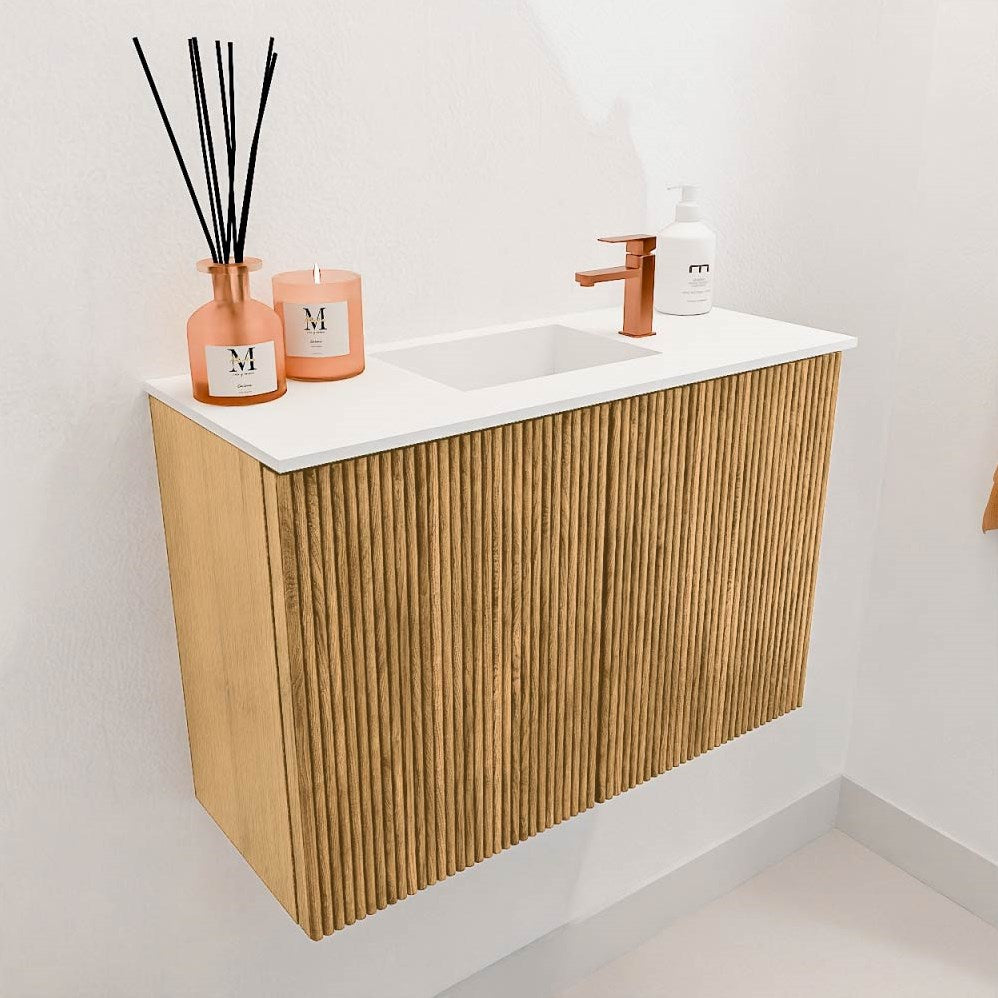 JOYA 60cm toiletmeubel kleur Oak. Wastafel FAYE positie Midden 1 kraangat kleur Talc.