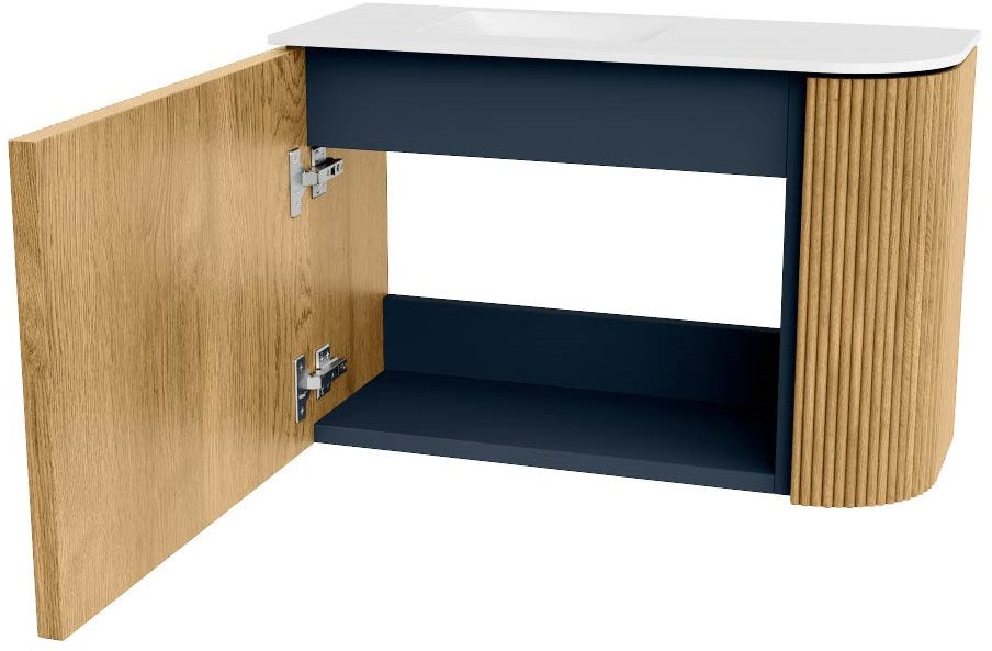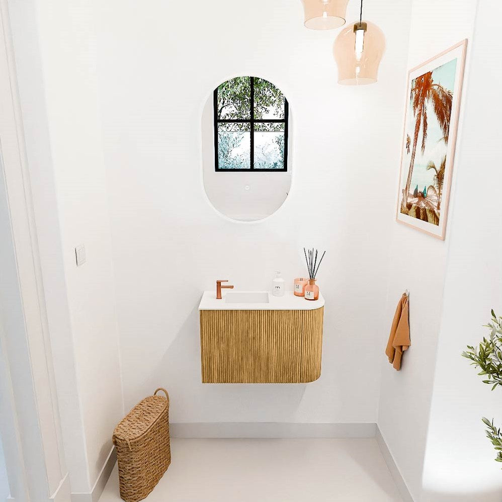 JOYA 61,6cm toiletmeubel ronding rechts kleur Oak. Wastafel FAYE positie Links 1 kraangat kleur Talc.