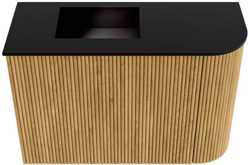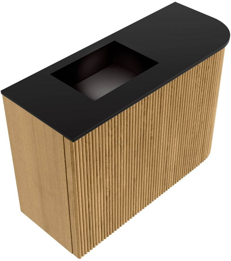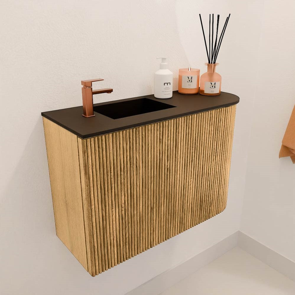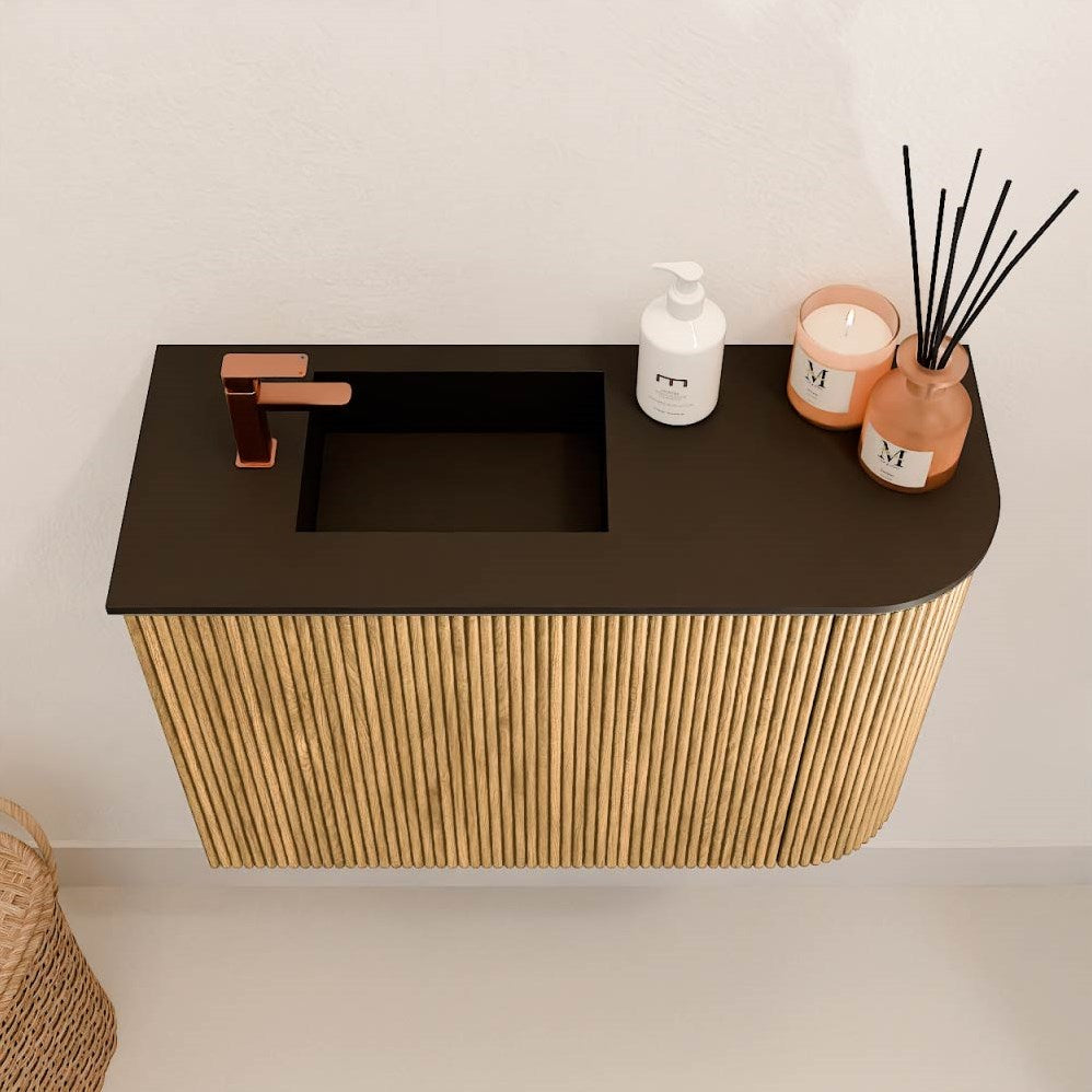 JOYA 61,6cm toiletmeubel ronding rechts kleur Oak. Wastafel FAYE positie Links 1 kraangat kleur Urban.