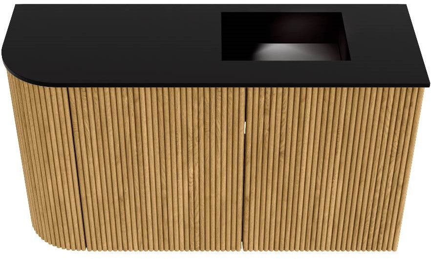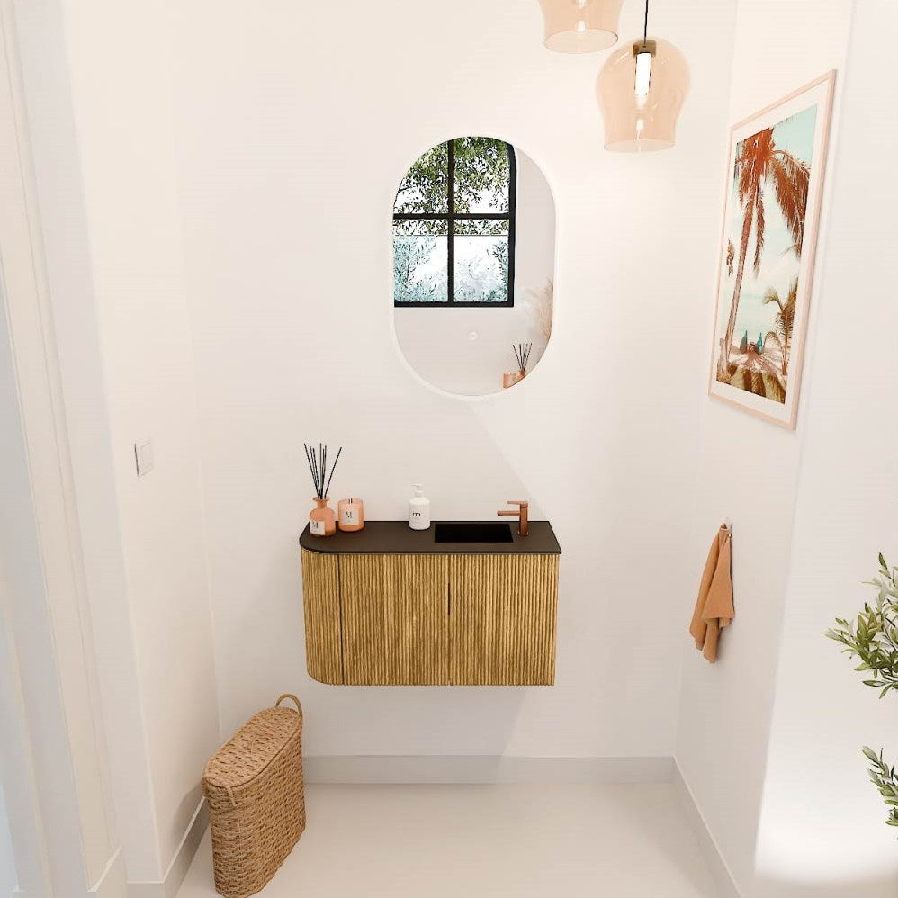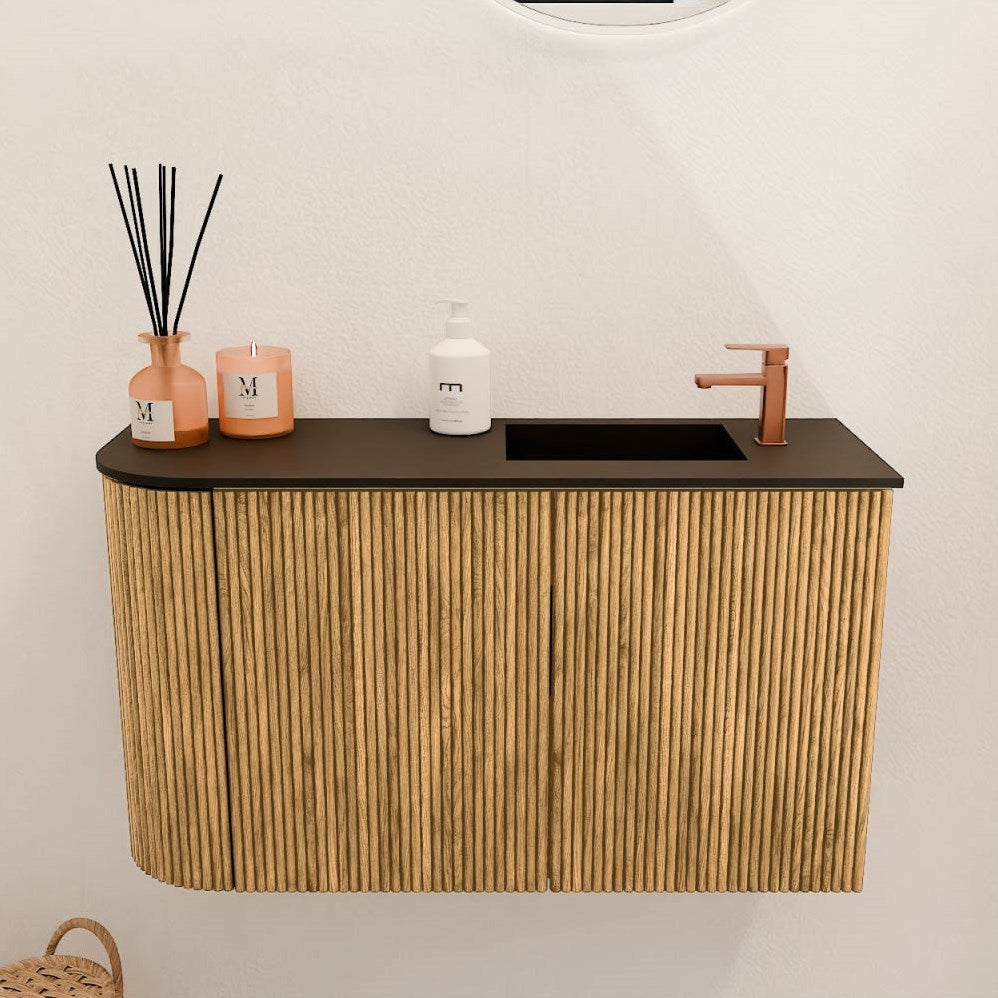 JOYA 71,6cm toiletmeubel ronding links kleur Oak. Wastafel FAYE positie Rechts 1 kraangat kleur Urban.