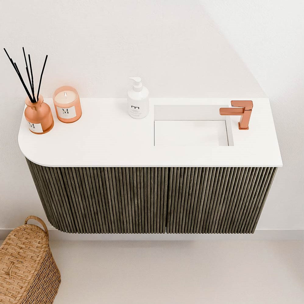 JOYA 71,6cm toiletmeubel ronding links kleur Shadow. Wastafel FAYE positie Rechts 1 kraangat kleur Talc.