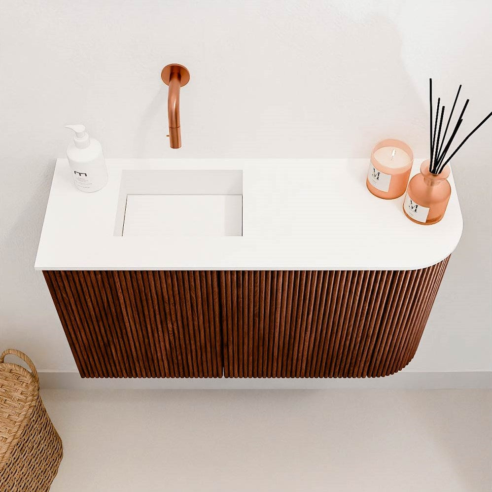 Geef jouw toiletruimte een stijlvolle en luxe uitstraling met het JOYA toiletmeubel van Mondiaz. Dit prachtige meubel is gemaakt van massief eikenhout en eiken fineer, wat zorgt voor een natuurlijke look en een hoogwaardige kwaliteit. Het unieke design met verticale ribbels maakt dit meubel een echte blikvanger in elk interieur.
