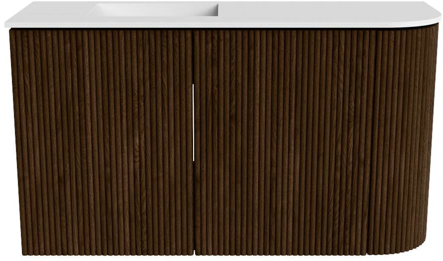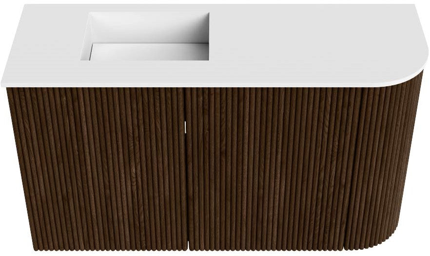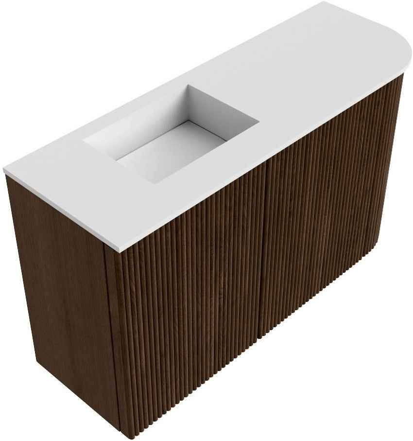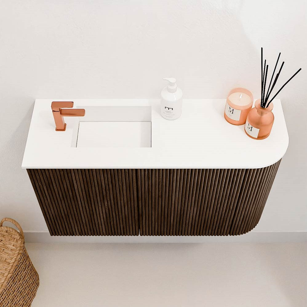 JOYA 71,6cm toiletmeubel ronding rechts kleur Walnut. Wastafel FAYE positie Links 1 kraangat kleur Talc.