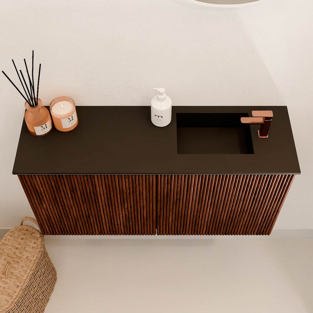 • Inclusief elegante Solid Surface wastafel in wit (Talc) of zwart (Urban).