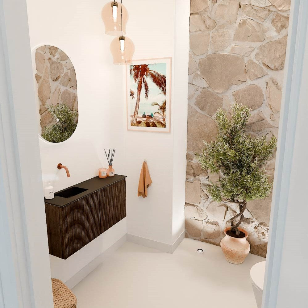 JOYA 80cm toiletmeubel kleur Walnut. Wastafel FAYE positie Links Zonder kraangat kleur Urban.