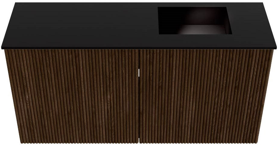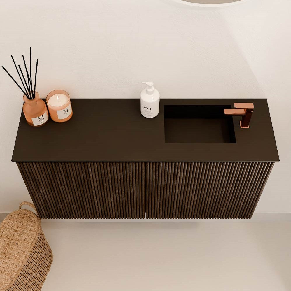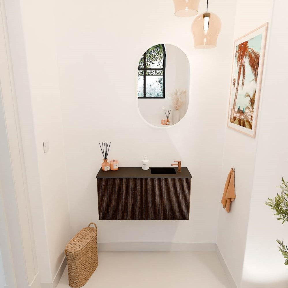 JOYA 80cm toiletmeubel kleur Walnut. Wastafel FAYE positie Rechts 1 kraangat kleur Urban.