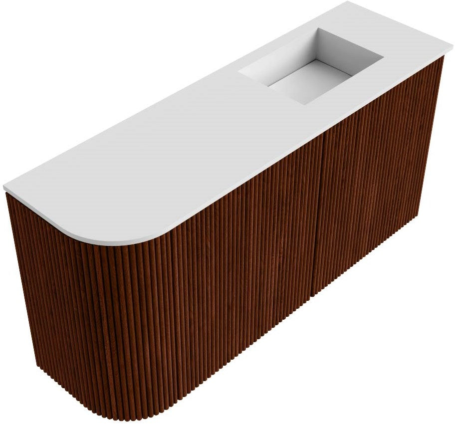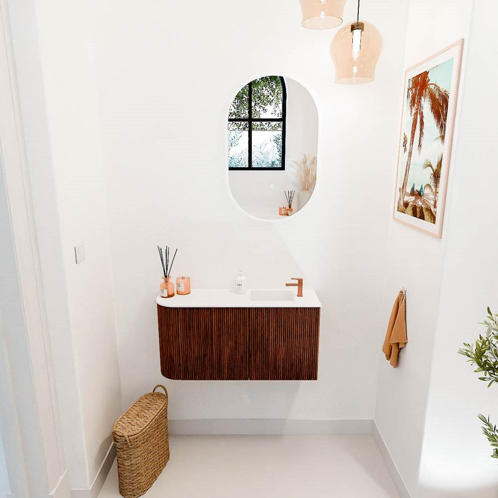 JOYA 81,6cm toiletmeubel ronding links kleur Ruby. Wastafel FAYE positie Rechts 1 kraangat kleur Talc.