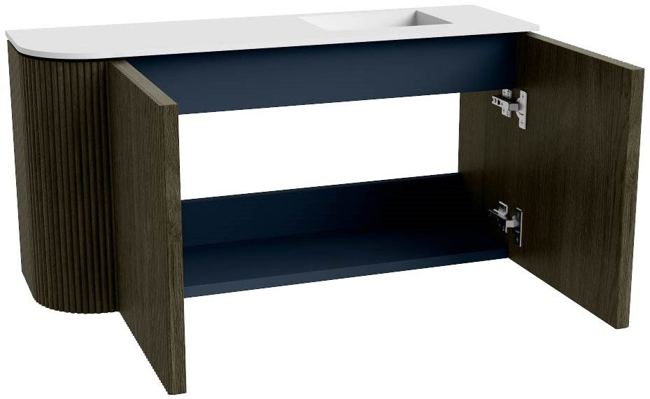 JOYA 81,6cm toiletmeubel ronding links kleur Shadow. Wastafel FAYE positie Rechts Zonder kraangat kleur Talc.