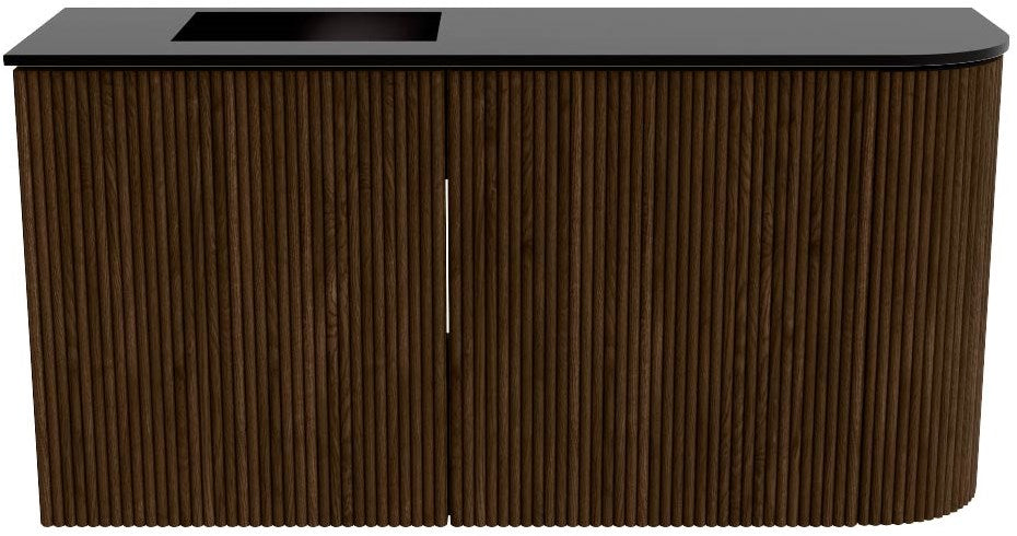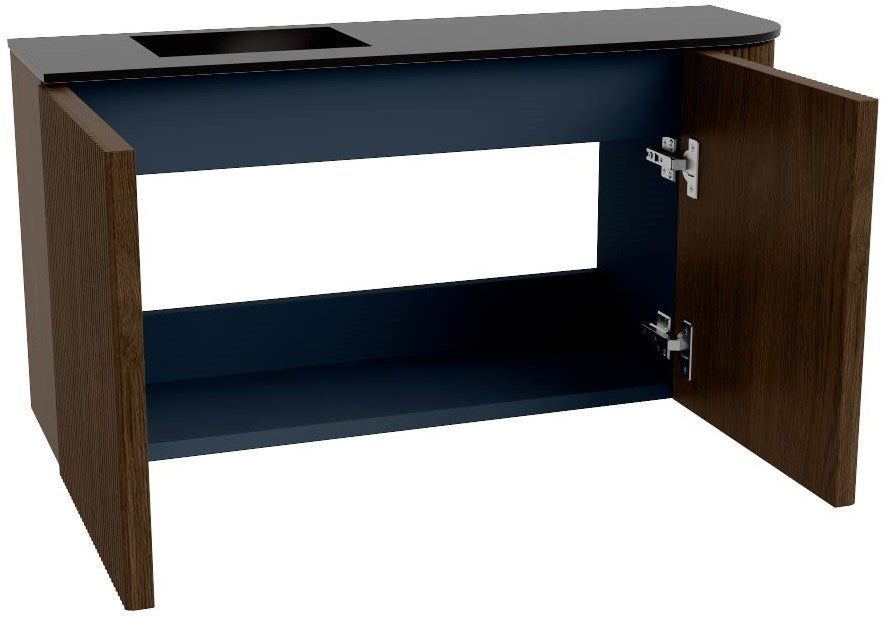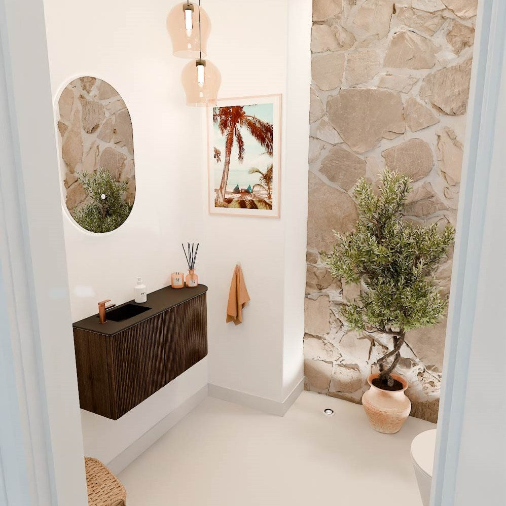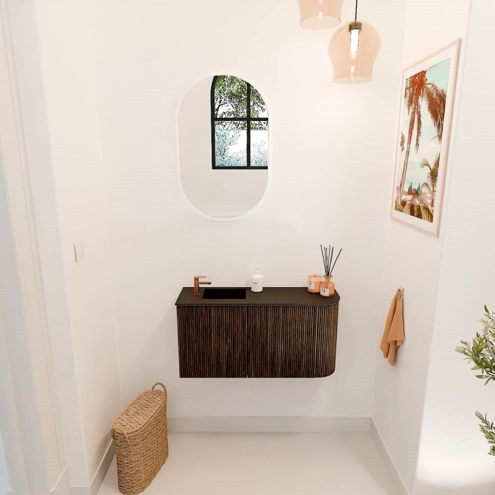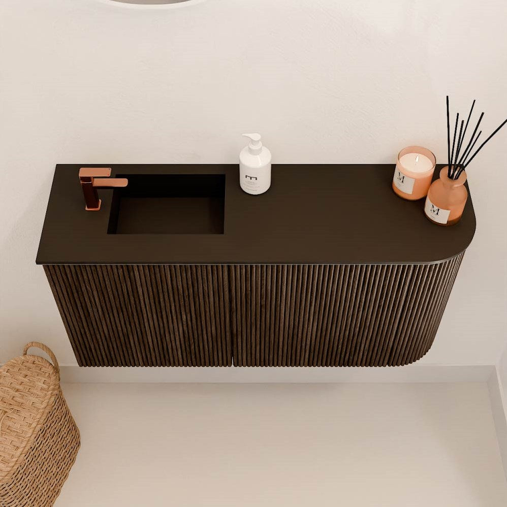 JOYA 81,6cm toiletmeubel ronding rechts kleur Walnut. Wastafel FAYE positie Links 1 kraangat kleur Urban.