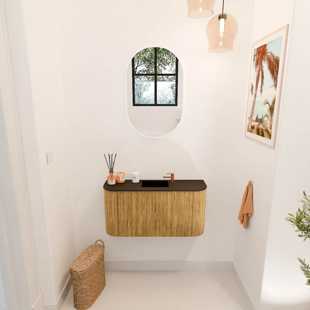 JOYA 83,2cm toiletmeubel ronding links + rechts kleur Oak. Wastafel FAYE positie Midden 1 kraangat kleur Urban.