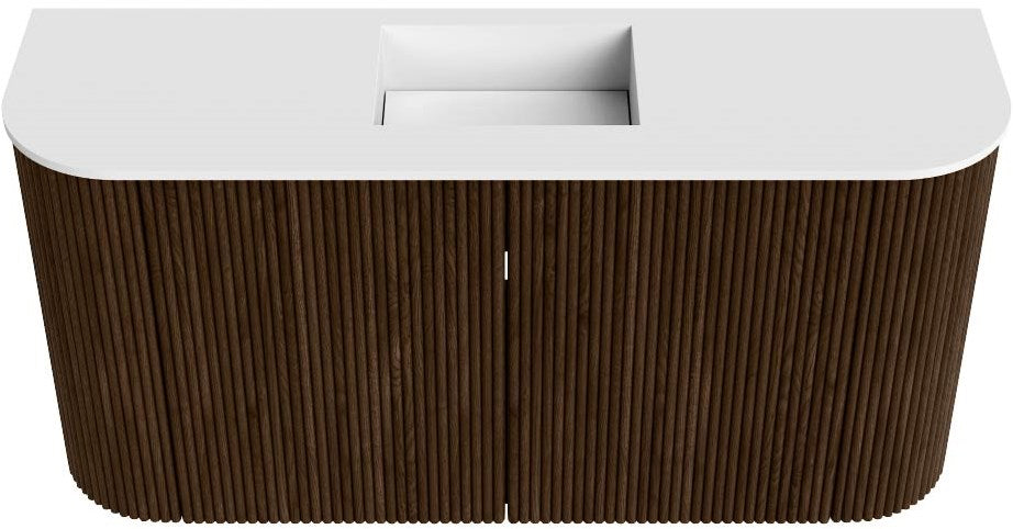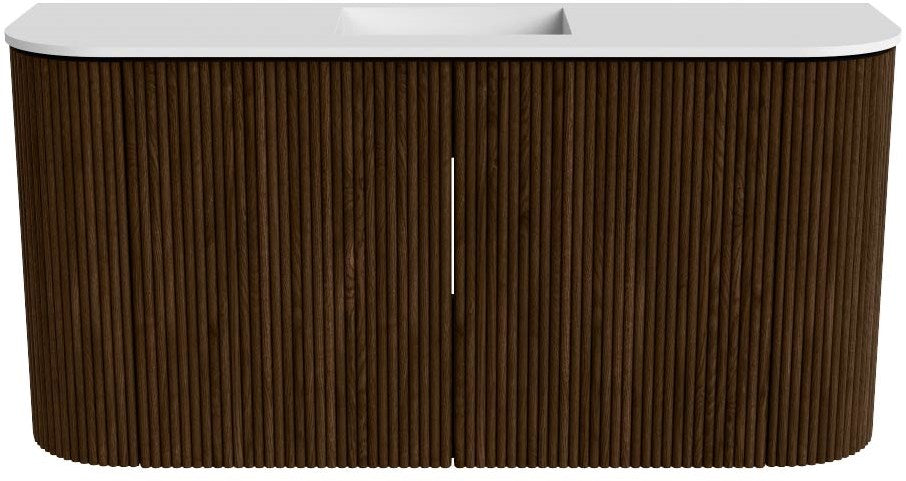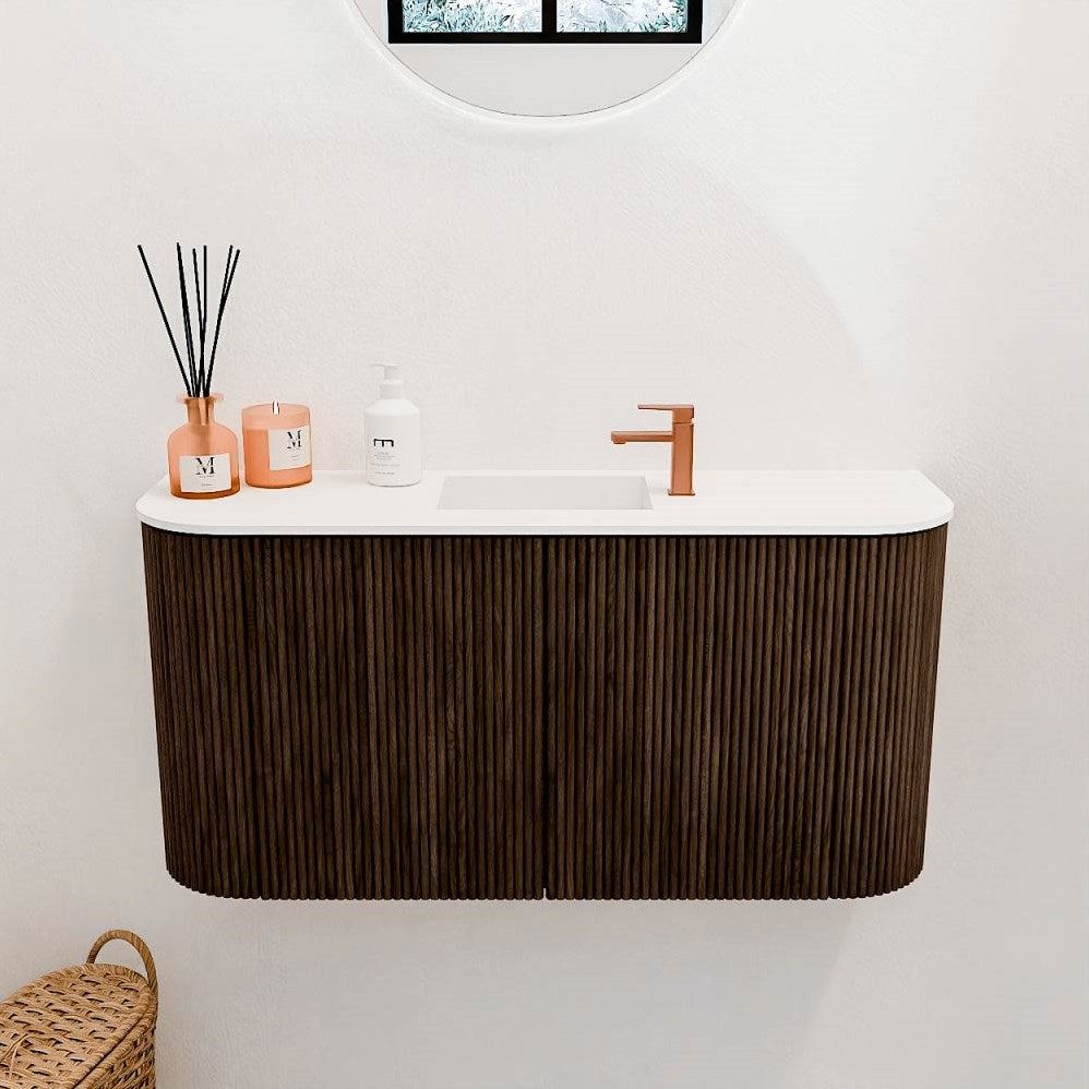 JOYA 83,2cm toiletmeubel ronding links + rechts kleur Walnut. Wastafel FAYE positie Midden 1 kraangat kleur Talc.