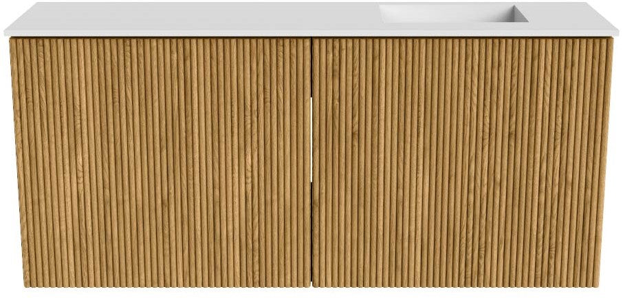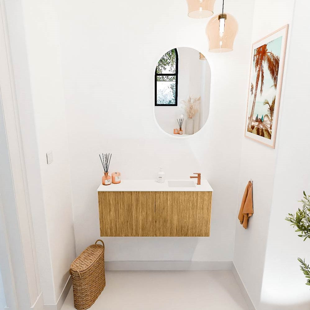 JOYA 90cm toiletmeubel kleur Oak. Wastafel FAYE positie Rechts 1 kraangat kleur Talc.