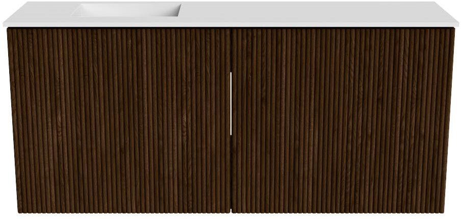 JOYA 90cm toiletmeubel kleur Walnut. Wastafel FAYE positie Links Zonder kraangat kleur Talc.