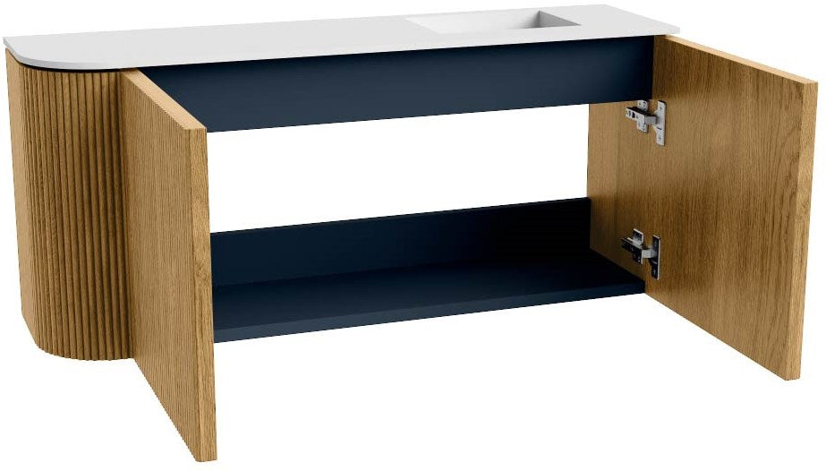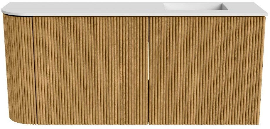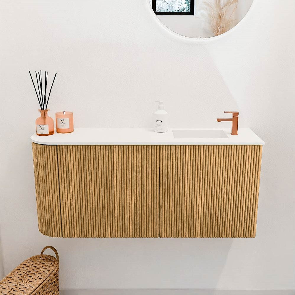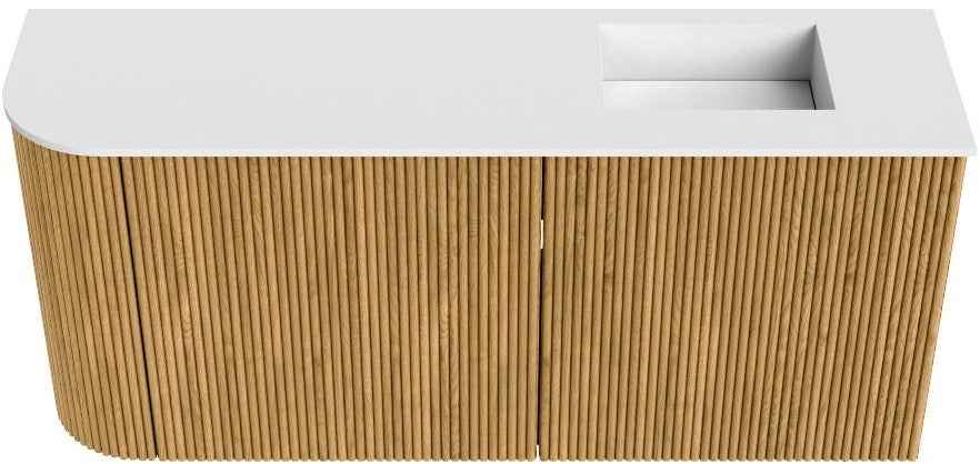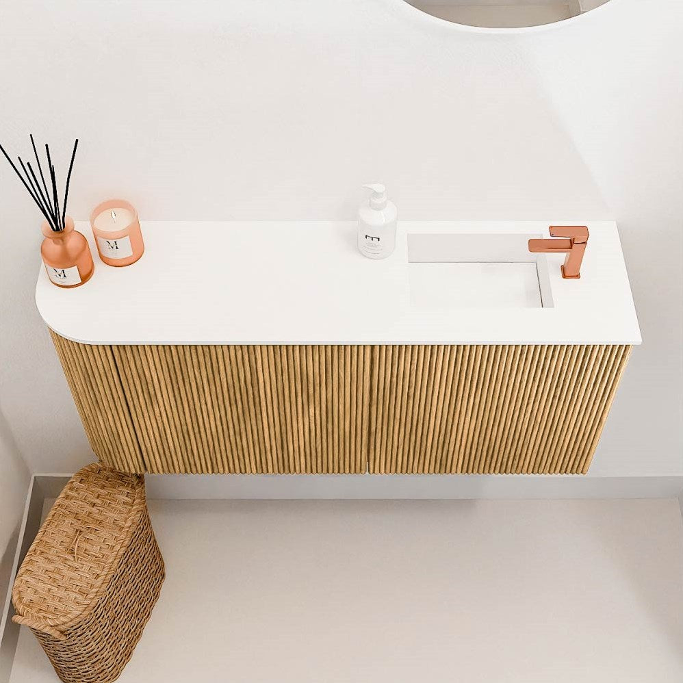 JOYA 91,6cm toiletmeubel ronding links kleur Oak. Wastafel FAYE positie Rechts 1 kraangat kleur Talc.
