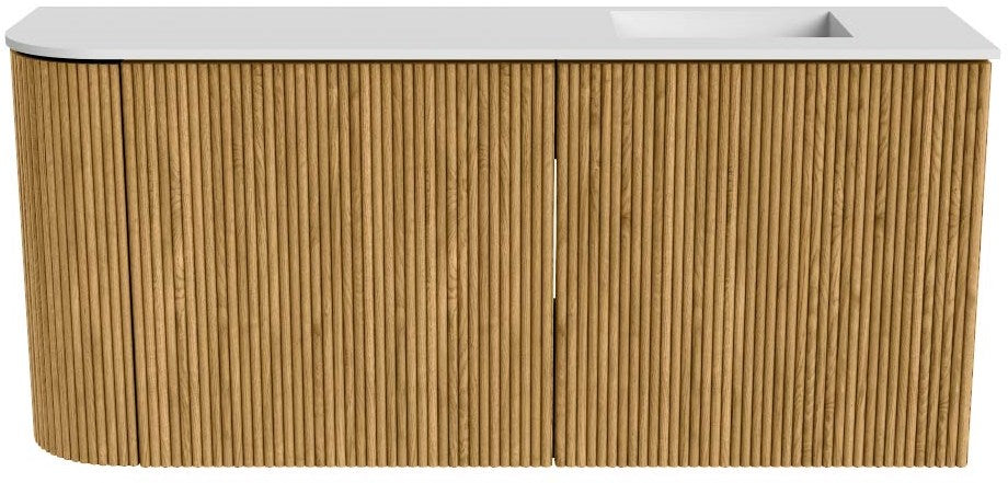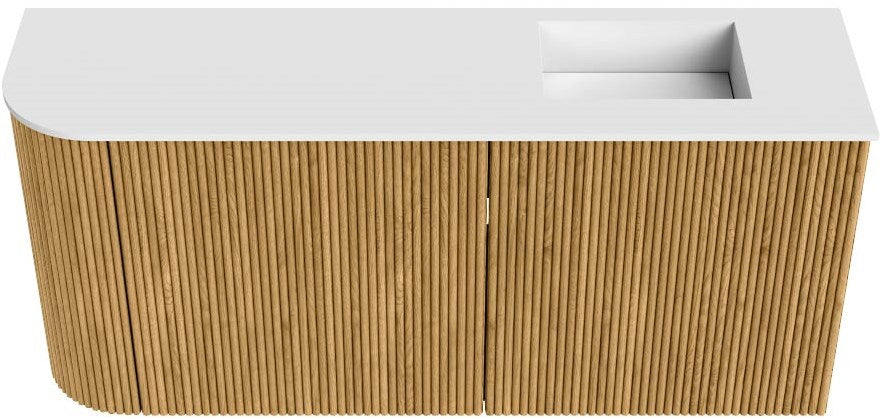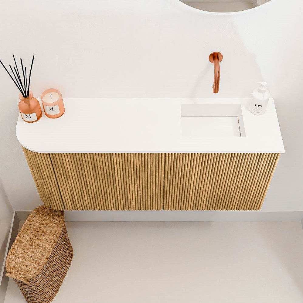 JOYA 91,6cm toiletmeubel ronding links kleur Oak. Wastafel FAYE positie Rechts Zonder kraangat kleur Talc.