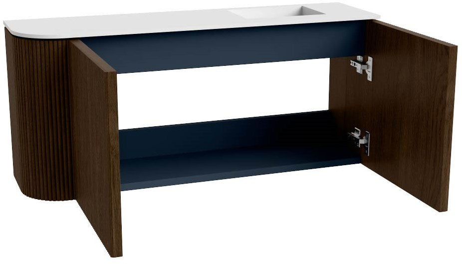 JOYA 91,6cm toiletmeubel ronding links kleur Walnut. Wastafel FAYE positie Rechts Zonder kraangat kleur Talc.