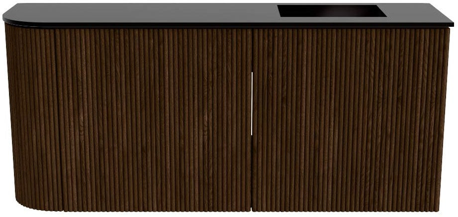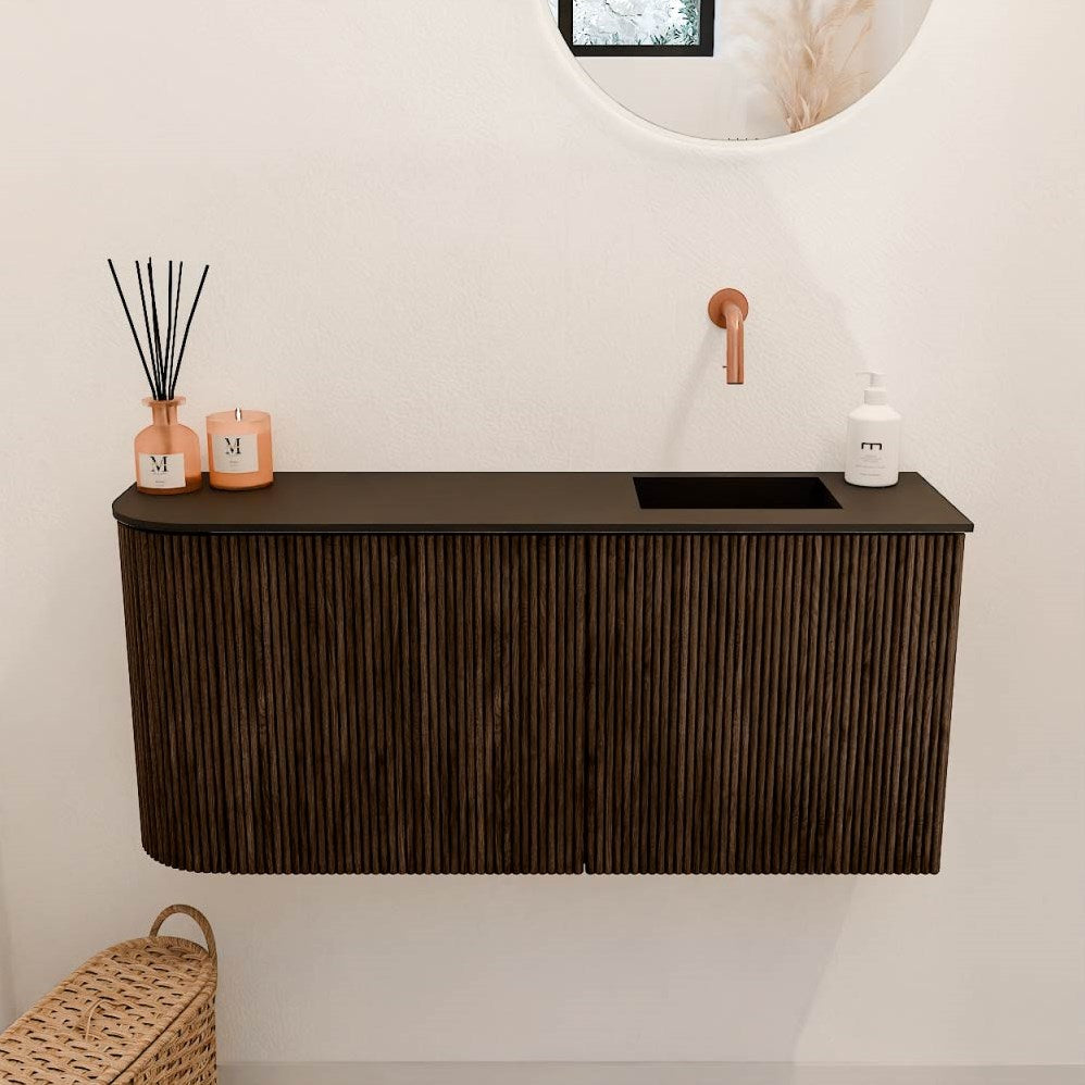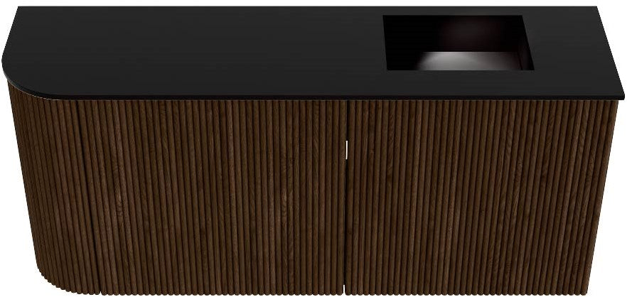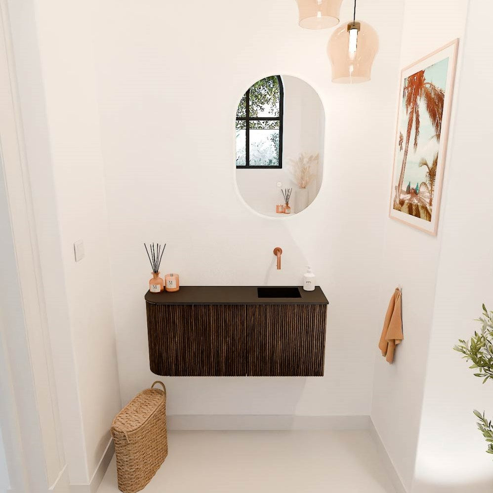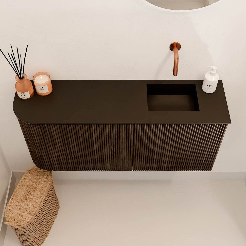 JOYA 91,6cm toiletmeubel ronding links kleur Walnut. Wastafel FAYE positie Rechts Zonder kraangat kleur Urban.