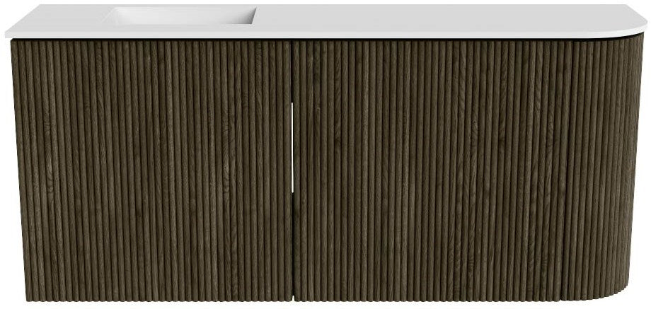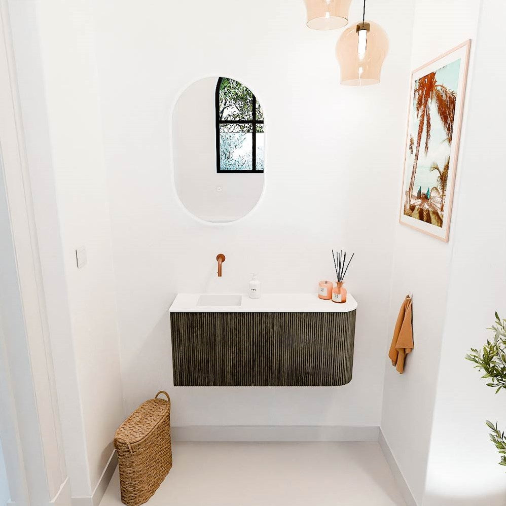 JOYA 91,6cm toiletmeubel ronding rechts kleur Shadow. Wastafel FAYE positie Links Zonder kraangat kleur Talc.