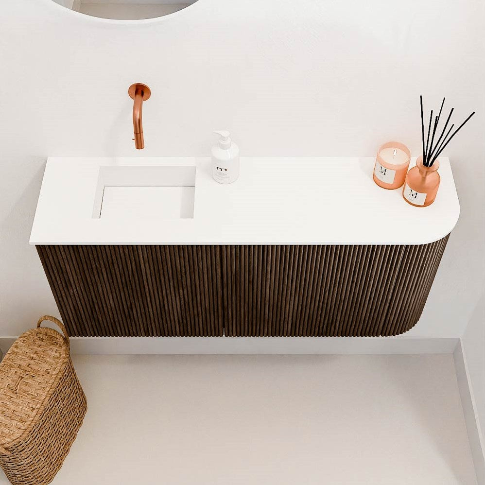 JOYA 91,6cm toiletmeubel ronding rechts kleur Walnut. Wastafel FAYE positie Links Zonder kraangat kleur Talc.