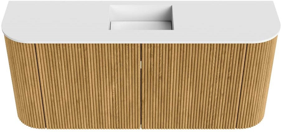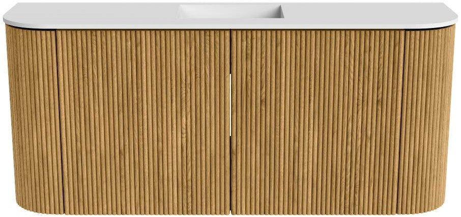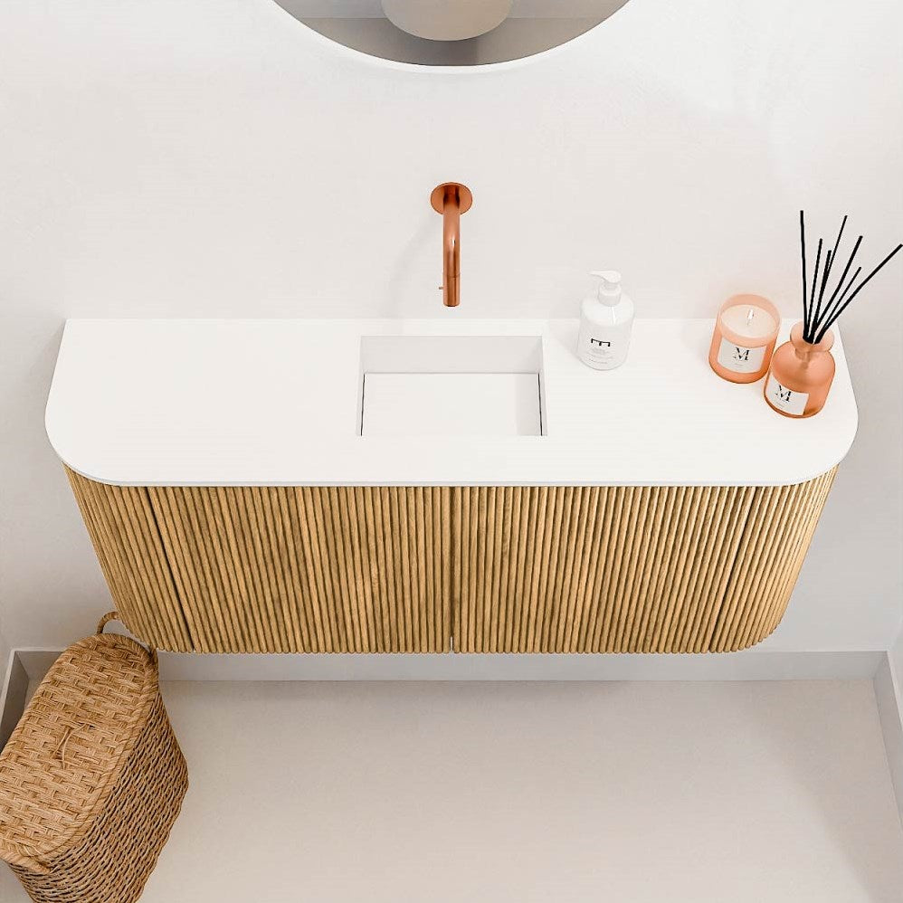 JOYA 93,2cm toiletmeubel ronding links + rechts kleur Oak. Wastafel FAYE positie Midden Zonder kraangat kleur Talc.